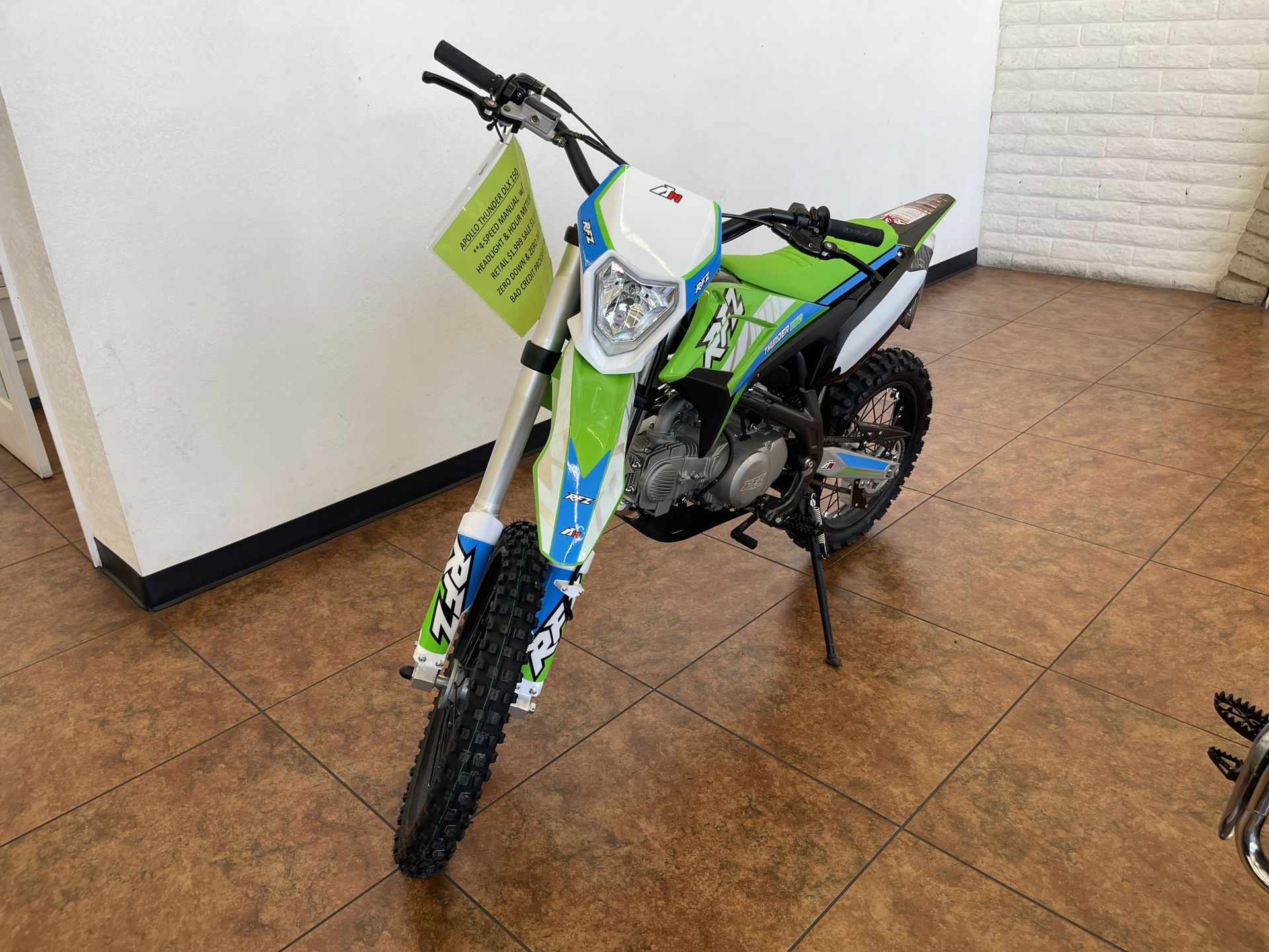 Headlight Model!! Just Arrived! *** ZERO MILES ** Brand new Apollo 150cc Thunder Large frame dirt bikes with 19/16 wheels and tires.We will beat any dealer in Arizona on this bike! Retail Price $1999 Sales Price $1549 !! Save $450.00!! Good and Bad Credit Options! Zero Down and Zero Interest package! 1 Year Warranty! Brand new 150cc full clutch dirt bikes with Upgraded suspension, alloy wheels / hubs, foldable brake and clutch handles , factory warranty and easy finance! Lowest Prices in Arizona! Advanti Powersports 1549 E Main St Mesa, AZ 85203 Wednesday to Friday 10am to 6PM Saturday 10am to 4pm Lowest prices on dirt bikes , pit bikes , street bikes, quads, go karts, golf carts, UTV’s, atvs motorcycles, fat tire scooters and electric scooters like honda yamaha suzuki kawaski ssr rebel coolster kayo trailmaster
