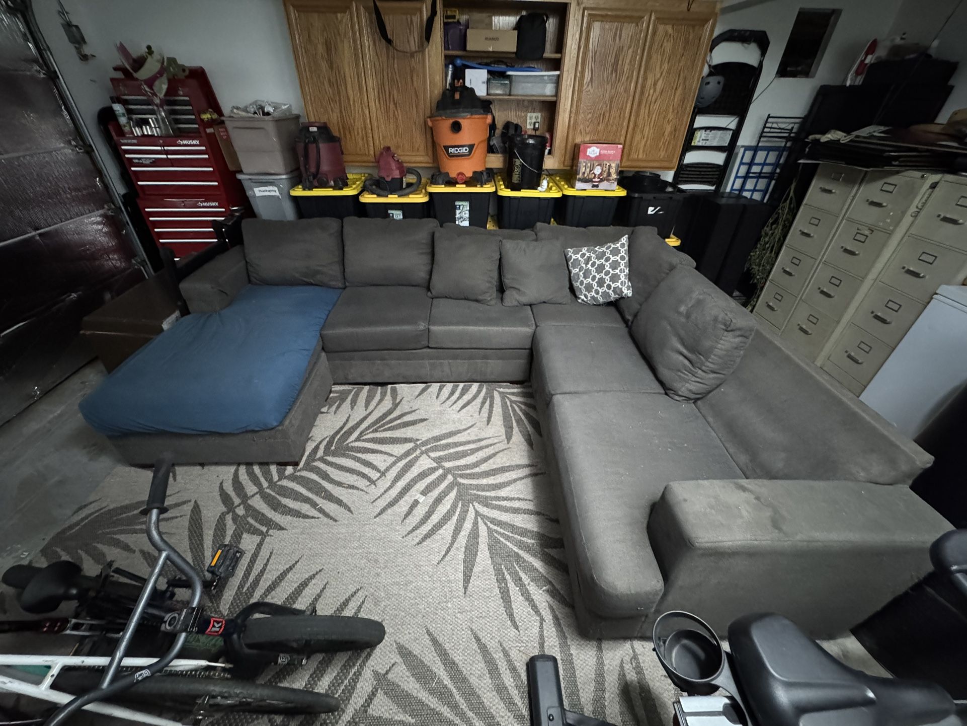 It’s 126” x 98” very used and is missing one back cushion, repair rip on one arm rest some cat scratches, GOOD FOR A GARAGE couch, pick up only!