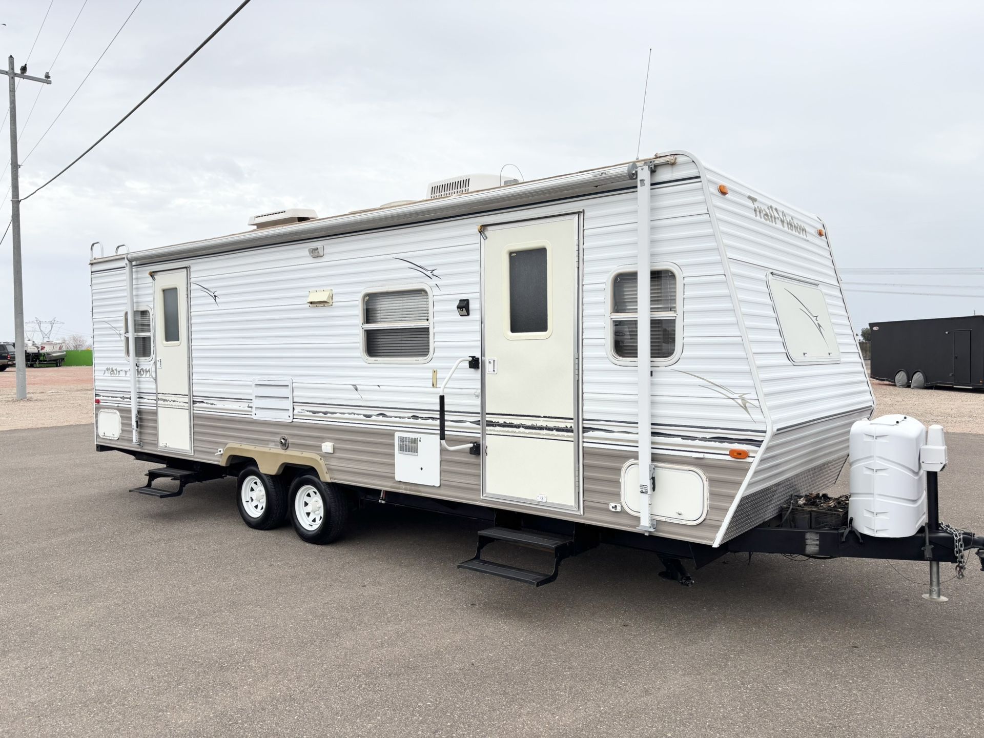 Hi, we are selling our 2005 trail vision by R vision 26 foot Tandem axle Fully self-contained Gas and electric refrigerator Three burner stove Microwave and oven Ice cold AC and heater works great Ice cold refrigerator Everything works great in this RV well-maintained It can sleep up to 6 comfortably AM/FM radio Flatscreen TV Lots of storage space throughout this RV Solar panel system all hooked up works great Rear queen, size bed No pets and no smoking no weird odors One dinette slide out Tires are in good condition Double door entry Outside shower Electric jack 4 stabilizers 4 good batteries Earning works great 2 propane tanks This RV looks and toes excellent Too much to list please call for more information. My number is (contact info removed) Please, serious buyers only