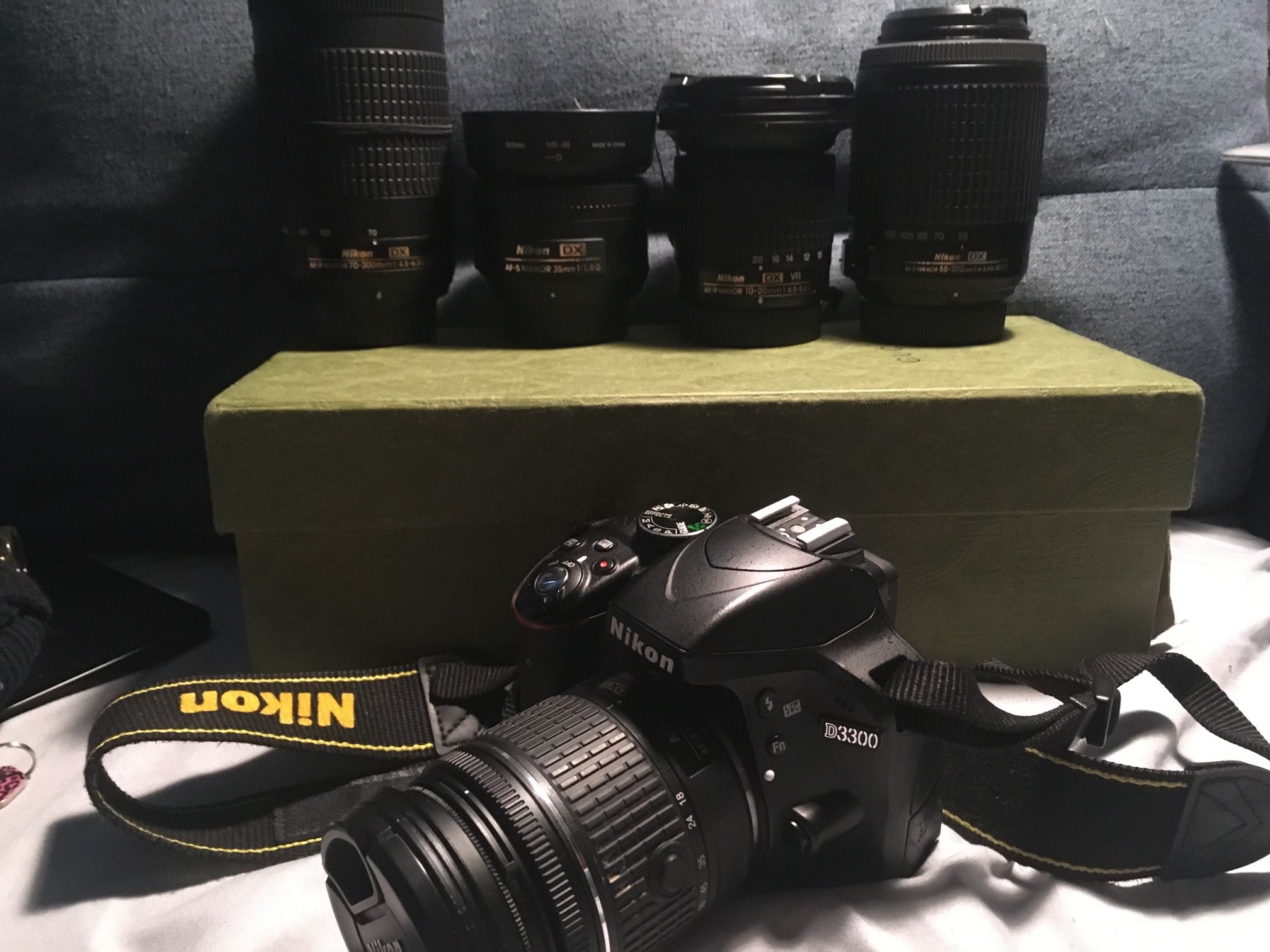 I’m selling my Nikon D 3300 camera with Lenses, 70-300mm, 35mm, 10-20mm, 55-200mm, 18-55mm, plus 6 extra batteries,