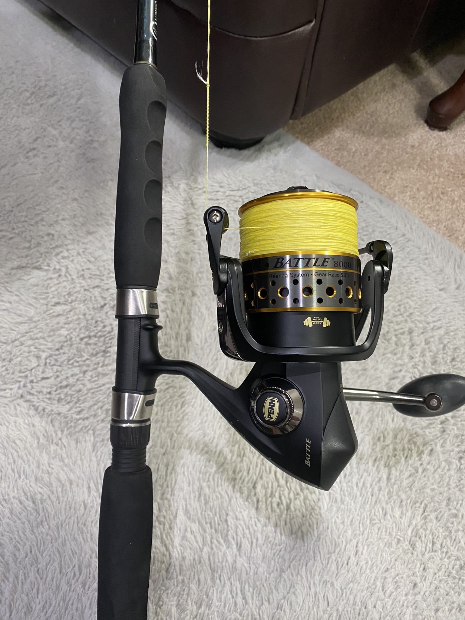- Shimano battle 8000 ratio 5.3:1 - rod length: 7’2” power: medium action: fast line weight: 20-50lb - loaded wutg heavy braid and double leader OPEN TO OFFERS