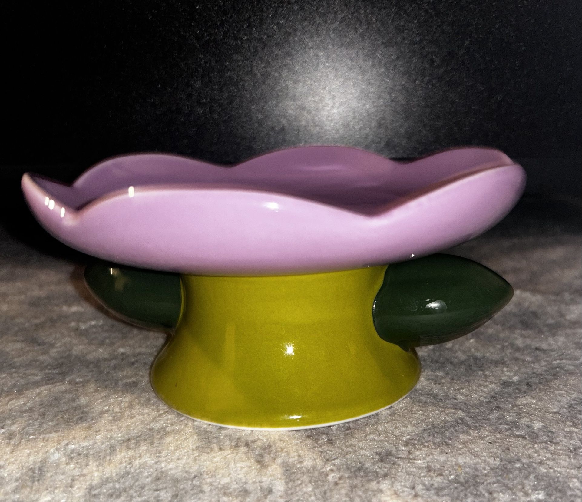 Hand-made purple ceramic flower plate. Perfect for elevated feeding of any cat or a small dog. Can feed dry or wet food on it.