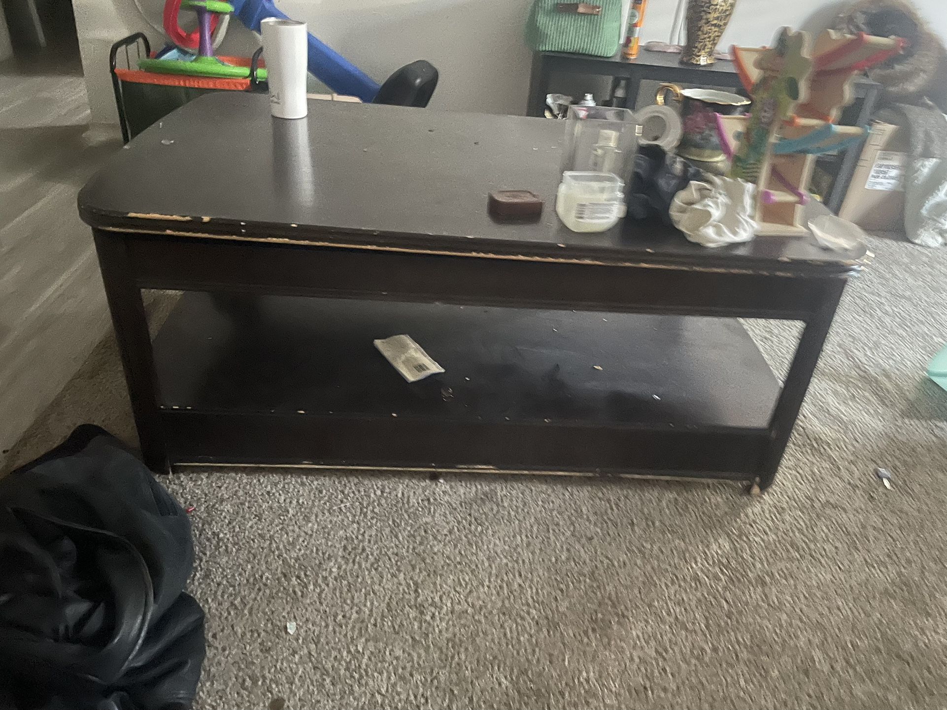 Pretty scraped up, but the top of it lifts up and has compartments hidden underneath