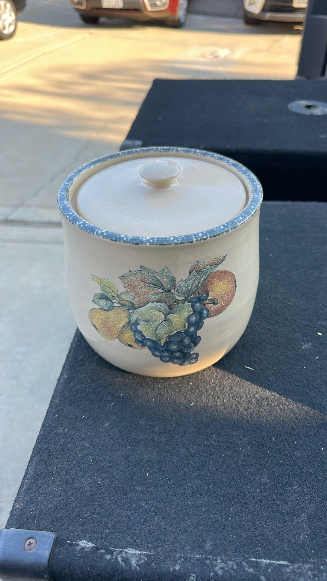 Grapes, fruit and leaves is the theme. Beige with cobalt blue accents. Home and garden from 2002. Oven safe. Very nice piece.