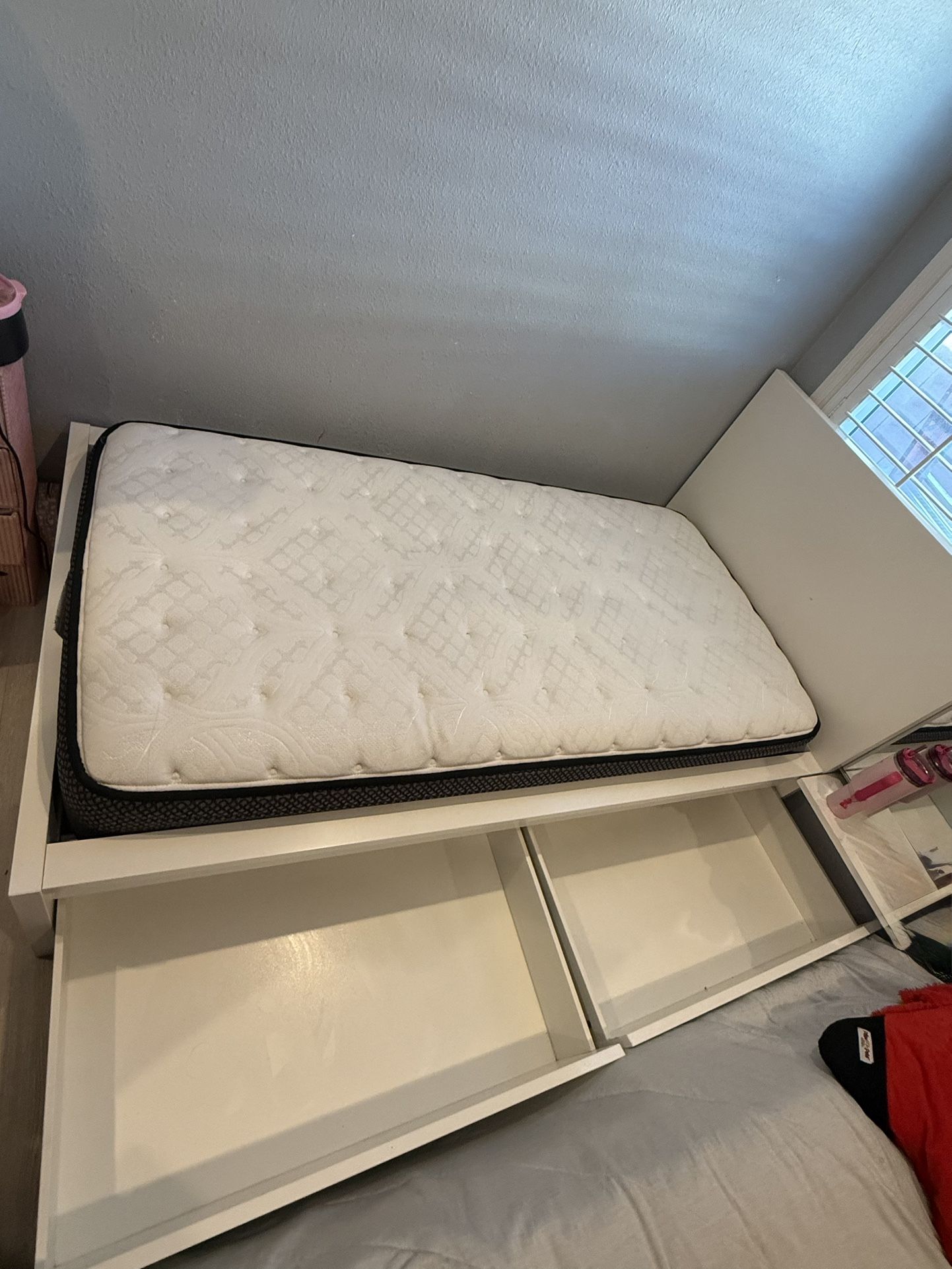 I have 2 Twin-size IKEA bed frame with storage drawers underneath. Sturdy and in good condition. Great for small rooms or if you need extra storage space. Clean white finish and the drawers slide smoothly. Mattress included if you want it (or happy to sell frame only). Pickup only. ✨ Open to reasonable offers. 150 each OBO