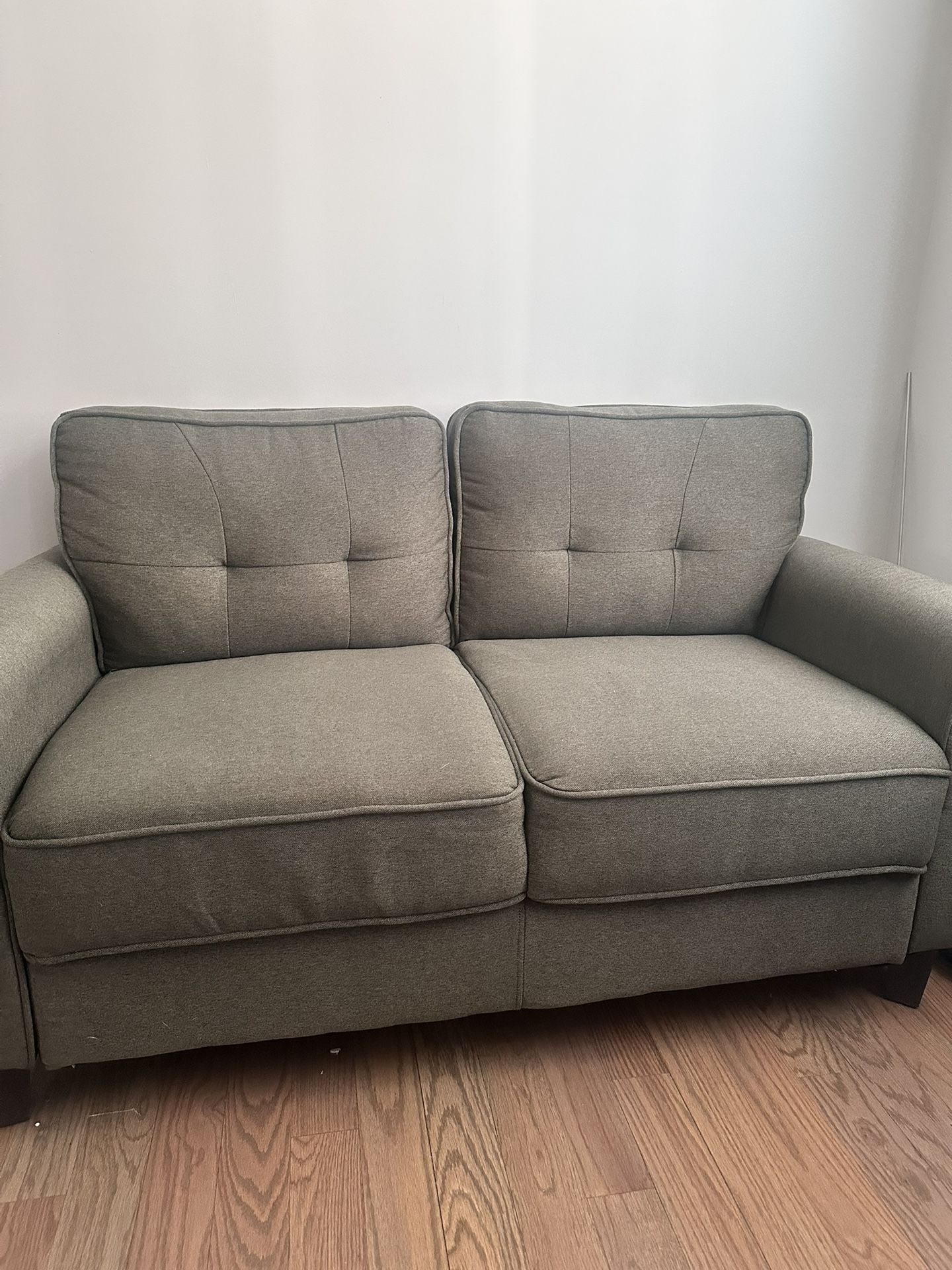 Comfortable 2-seater fabric couch in great condition. Neutral green color that matches almost any space. ✔ Clean, no stains or odors ✔ Cushions are supportive and comfortable ✔ Well cared for in a smoke-free and pet free home ✔ Perfect for apartments, living rooms, offices, or studios Selling because I’m moving. Pickup only.