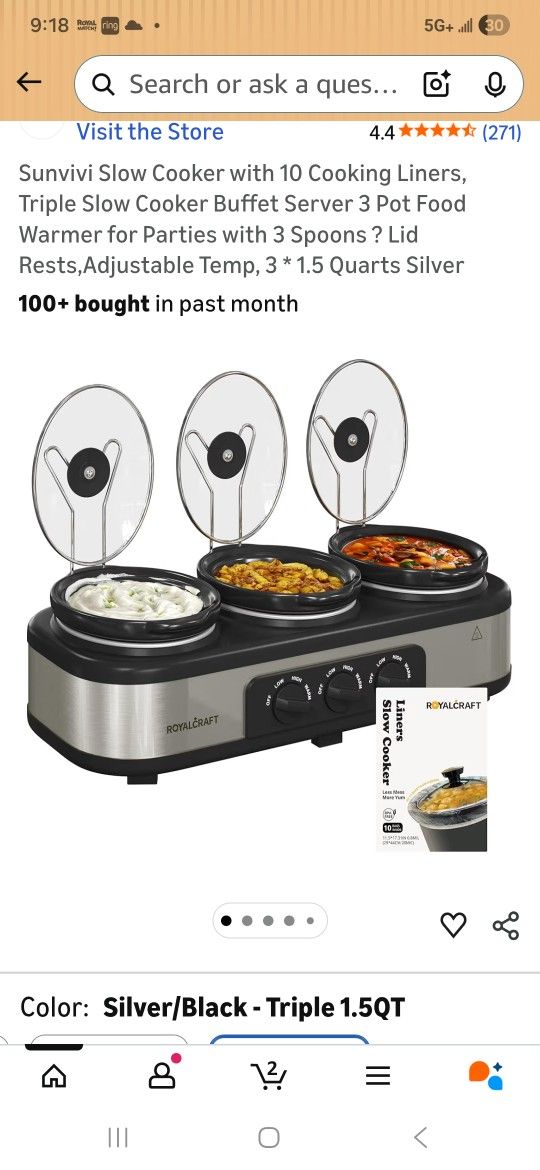 Sunvivi Slow Cooker with 10 Cooking Liners, Triple Slow Cooker Buffet Server 3 Pot Food Warmer for Parties with 3 Spoons ? Lid Rests,Adjustable Temp, 3 * 1.5 Quarts Silver