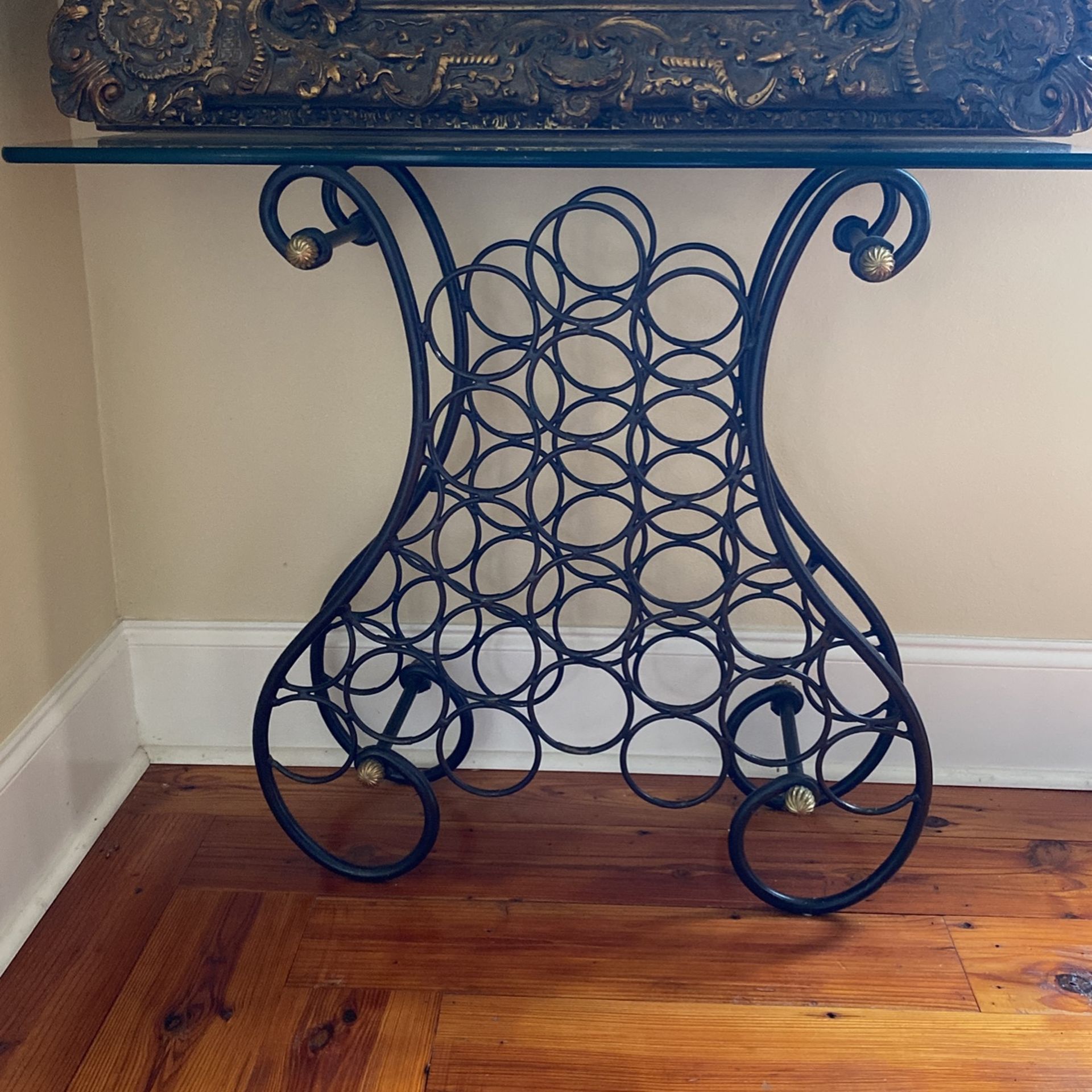 Iron & glass Wine Bottle Table 36”wide X 16” Deep X 30” tall