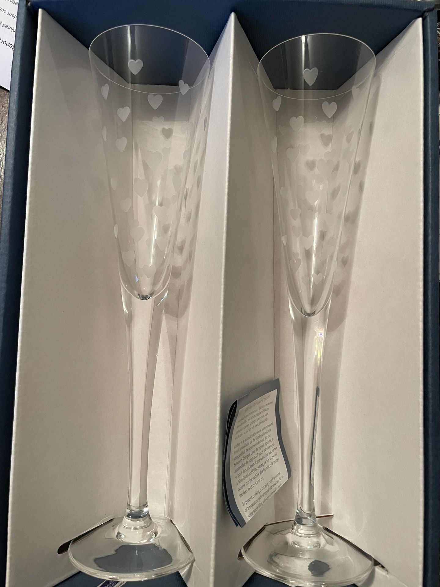 Marquis by Waterford pair of champagnes flutes with mini hearts. Used once.