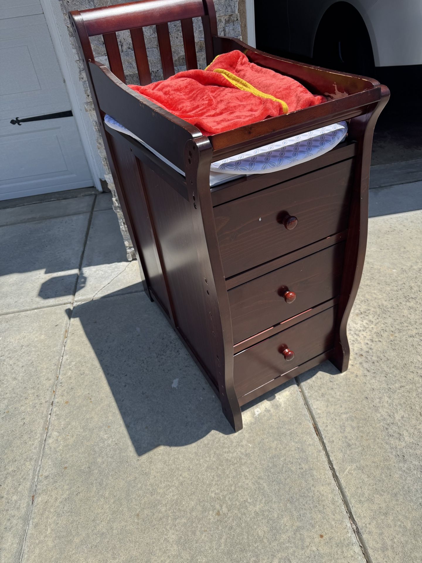 Wooden Baby Changing Table with two cushions, three drawers, and three shelves. Couple blankets included as well.