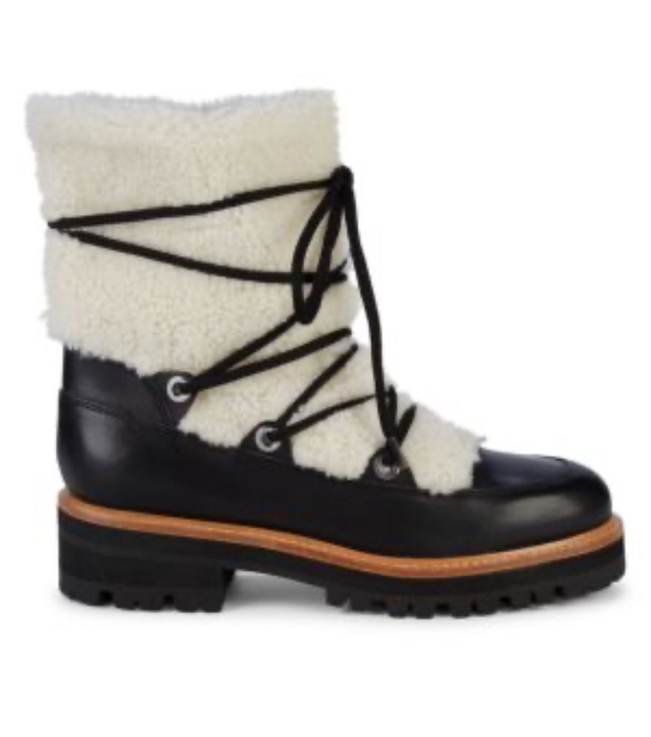 Winter-chic boots trimmed with plush shearling and set on lug soles. Leather and shearling upper Pull-on style. Leather lining Padded insole Dyed sheep fur type. Like new.