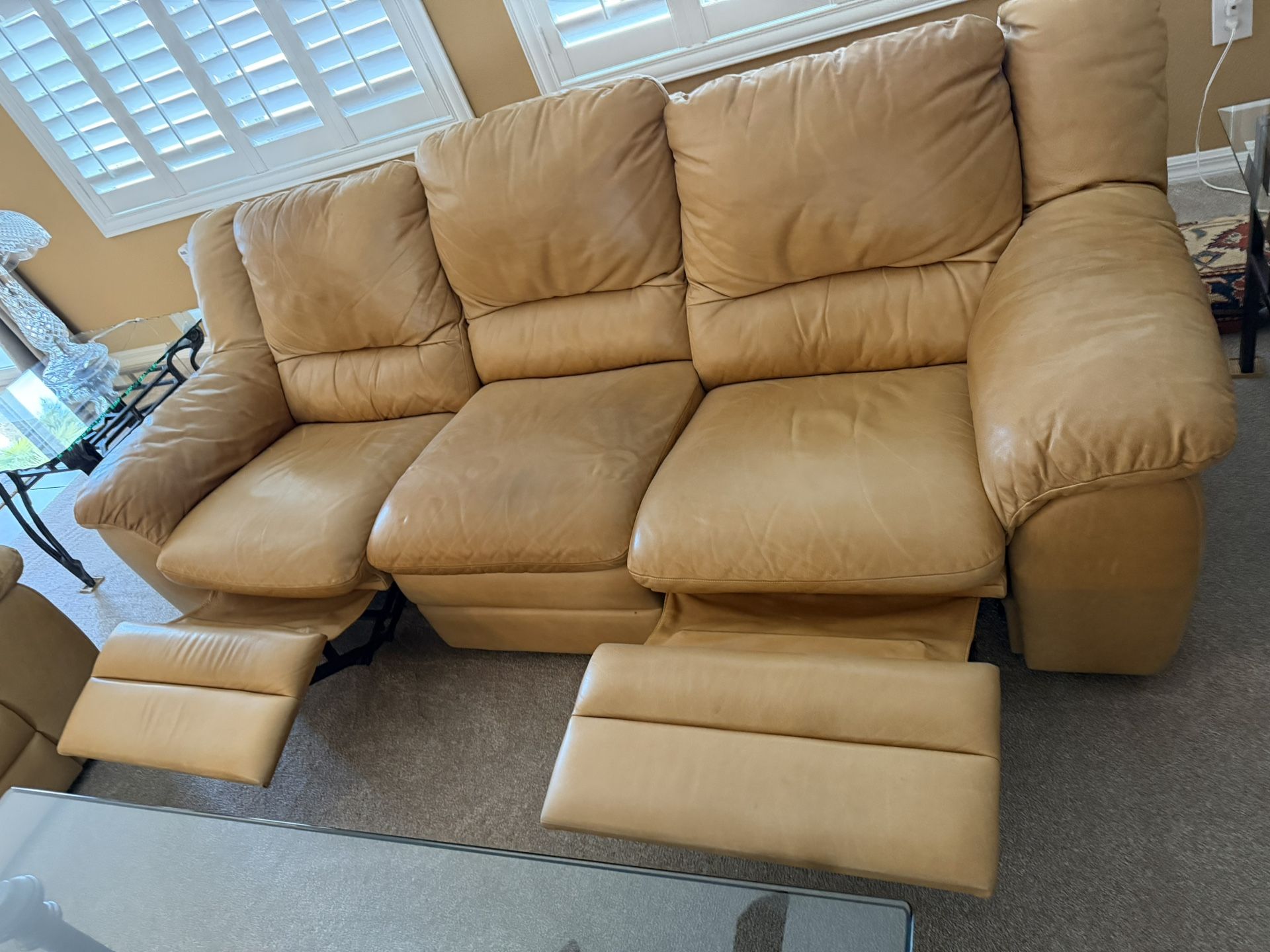 Gently used, all leather camel colored sofa with recliners at each end. 93 inches long x 36 inches deep. Excellent condition, ready for a new home! Pickup up; cash only $150
