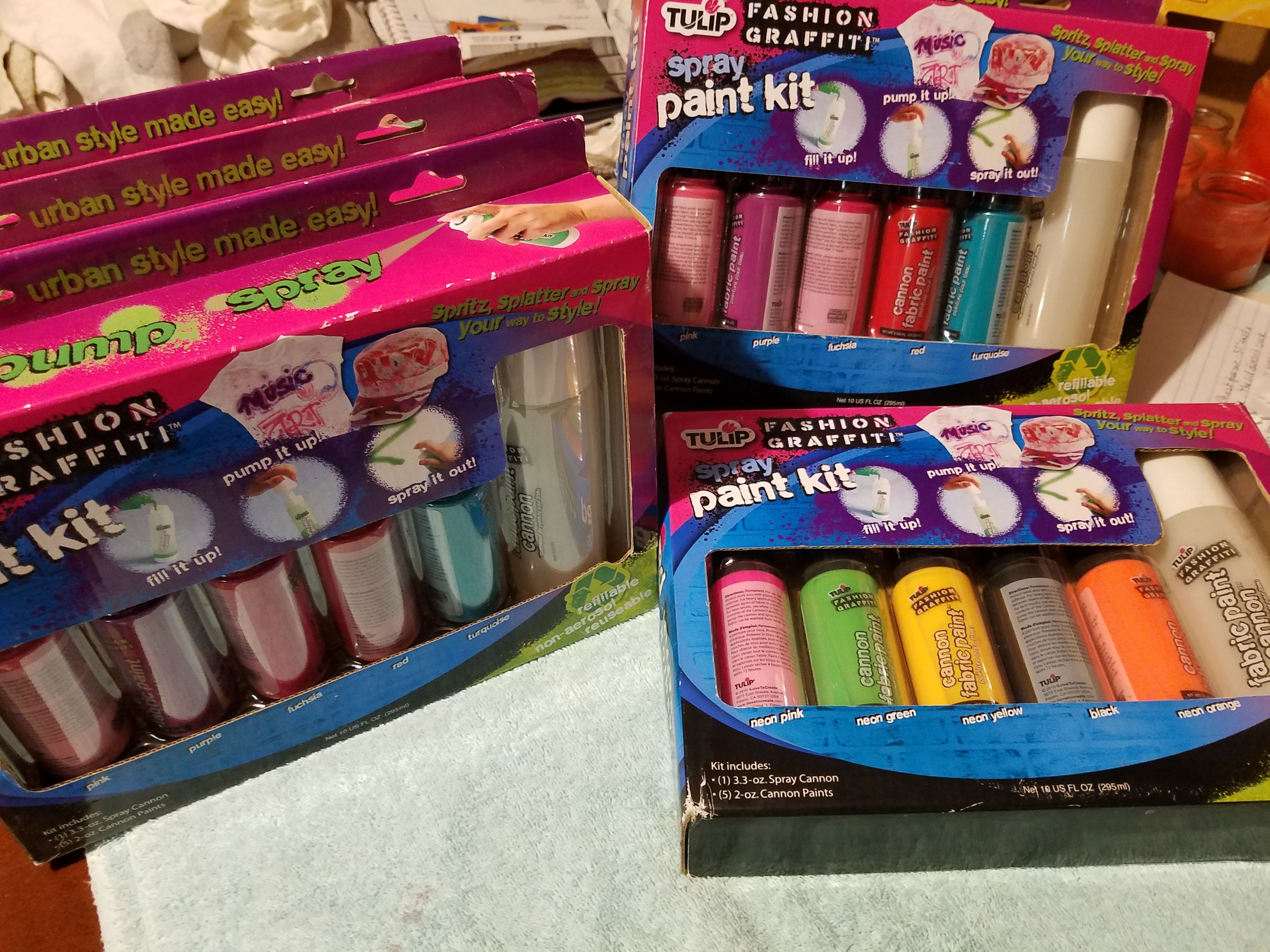 Tulip Spray Paint kit, New in box - bought for gift project but never used. Have 3 of the pink,purple, fuchsia,red & turquoise - price is $5.00 for 1. - buy all for $10.00. Porch pick up in Garland - No Holds.