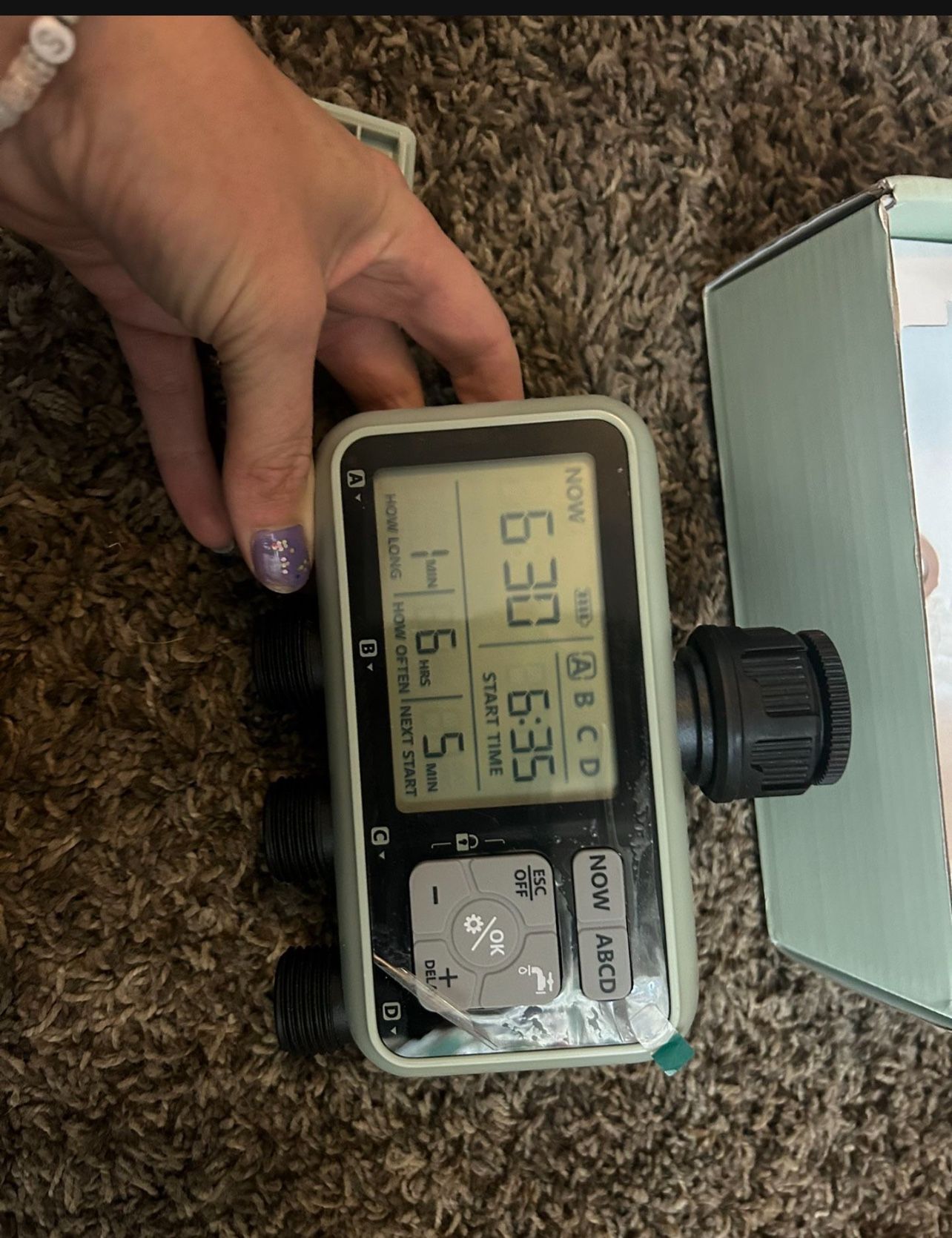 Brand new in box 【4 Outlet Separate Watering Timer 】Hose timer 4 zone makes it easier to schedule watering separately for different areas. You can set the Start Time, Watering Duration is 1s-360min, Watering Frequency from every 1 Min~24 H and from every day to every 15 days. Gives you more accuracy for your variable watering needs 【Timed Irrigation Mode 】 You can program the 4 outlets hose timer with a schedule to water automatically at a specified time. Thanks to four different watering frequency options, you can set the timer to water daily, every even or odd day only or according to your own custom schedule 【Rain Delay and Manual Watering 】 Rain delay mode allows you to skip one watering schedule to avoid overwatering and save much water in rainy days. If you need to watering immediately, you can switch to Manual Mode through the valve unit or through the app to use the faucet whenever you need it (Note: Diivoo 4 zone water timer without rain sensor, so you can postpone your schedule by the local weather forecast) 【Large LCD display 】 Diivoo hose timers for watering comes with a 3.2 × 2 inch large LCD display, which allows users to operate quickly. It can be screwed to any standard 3/4" garden outdoor hose. Additionally, the product requires 2 AA 1.5V alkaline batteries for power (Not included), and the battery life of new batteries can last up to 6 to 8 months 【Please Note 】Adequate water pressure needs to be provided when all 4 zone ports are operating at the same time, otherwise insufficient water pressure will result, reducing the flow of water through each zone port. It is recommended that the 4 zone ports are rotated to avoid insufficient water pressure