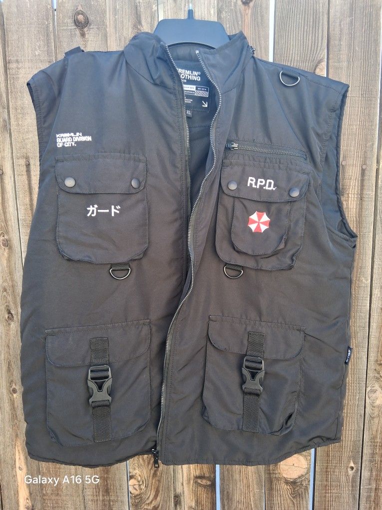 the vest is a black techwear vest with custom branding inspired by Resident Evil's Raccoon Police Department (RPD) and Biohazard elements, possibly using a KRMLNTech "Type -nemesis-" vest as a foundation. Sz. Xl like new in great condition