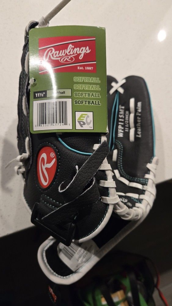 This is a Rawlings WFP115MT 11.5-inch fastpitch softball glove. Size: 11.5 inches Throwing Hand: Right Hand Throw Material: Features a leather palm and a soft, durable all-leather shell. Color: Black with white lacing and teal/mint accents. Features: Includes an adjustable wrist closure for a snug fit.
