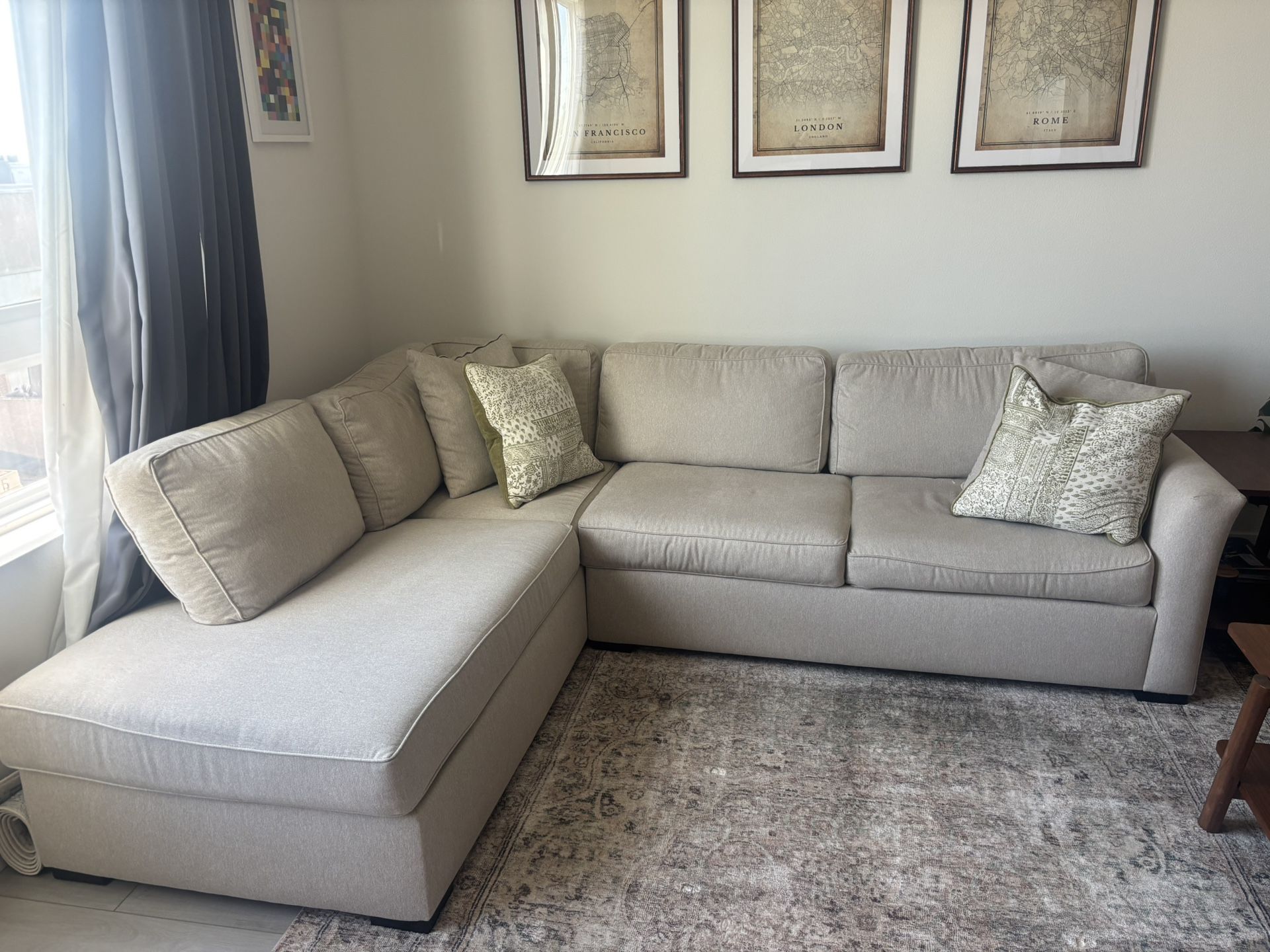 Clean, modern L-shaped sectional in beige that works with almost any decor style. Condition: Gently used, no rips or stains. From a smoke-free home. Local pickup only. Can help bring it downstairs/loading.