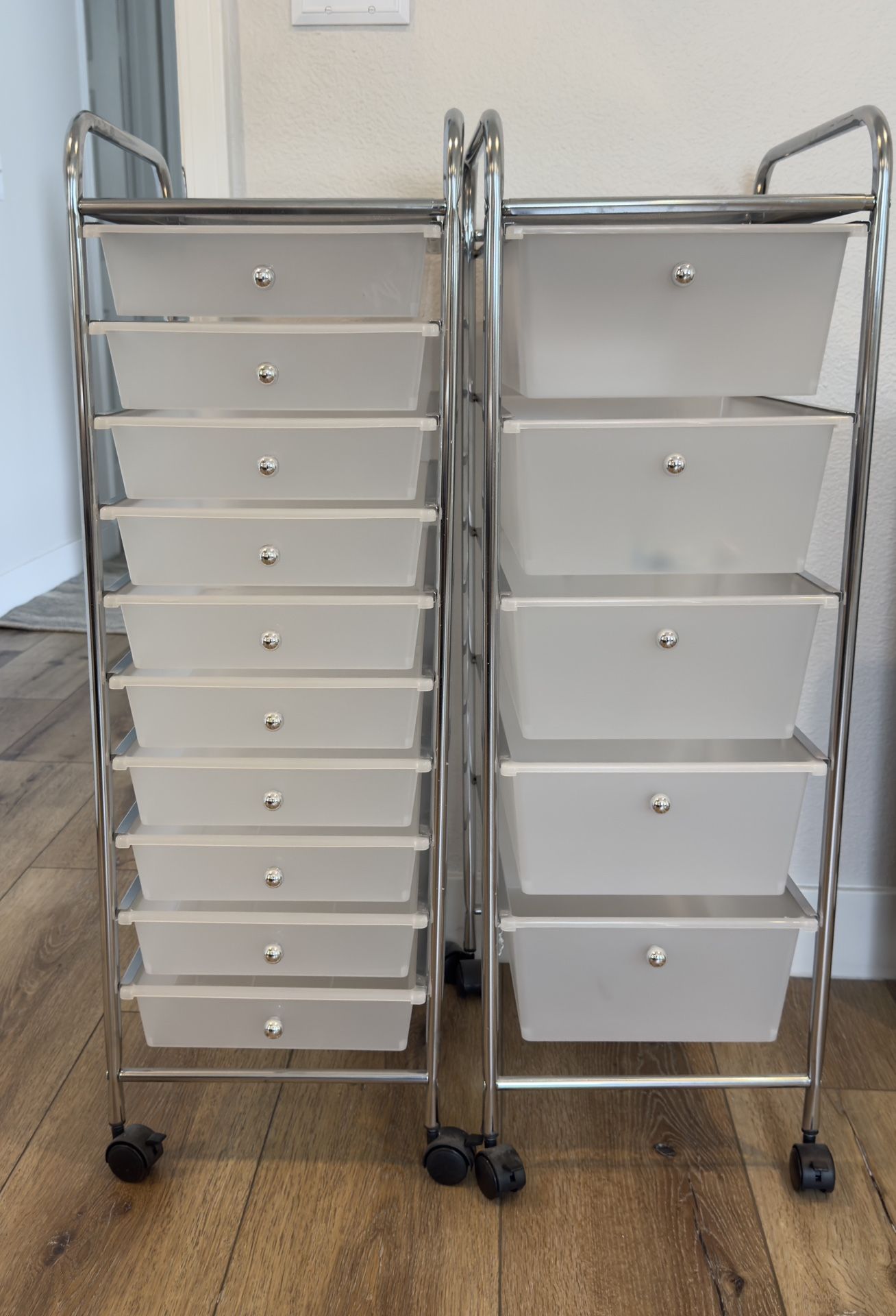 This listing is for two rolling carts One has 5 drawers The other one has 10 drawers Both approx 36” tall In exellent condition Pick up in Redondo Beach, CA