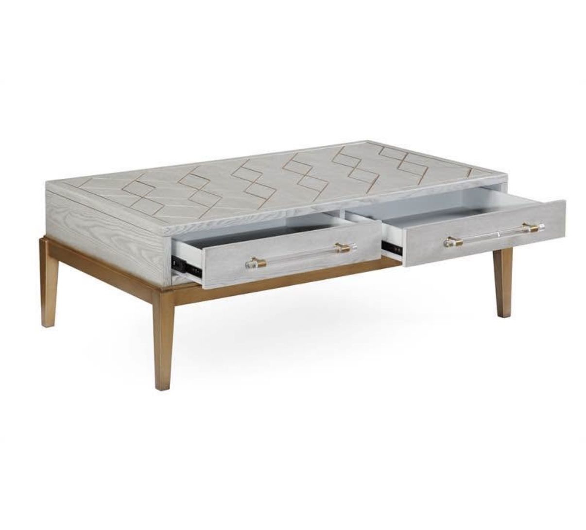 Elevate your living space with this perfect Perrine mix of modern design. Included in the set: • 1 Rectangular Cocktail Table – 48” L x 29” W x 18” H • 2 Matching Chairside Tables – 24” L x 16” W x 23” H each Why you’ll love it: • Soft graphite gray top with antique gold geometric inlay • Sleek gold legs & base for a chic, modern contrast • Custom acrylic drawer pulls add a designer touch • Crafted from hardwood solids for lasting quality • Sturdy & substantial – this is not flimsy furniture 💡 Incredible Value: Retail price for all three pieces is around $1,300 — get the entire set for just $250 (less than 40% of retail). Originally purchased from Jordan’s Furniture. Condition: Gently used, with a few small blemishes (see photos) but still absolutely gorgeous in any space. 💰 $250 for all 3 pieces – exceptional value
