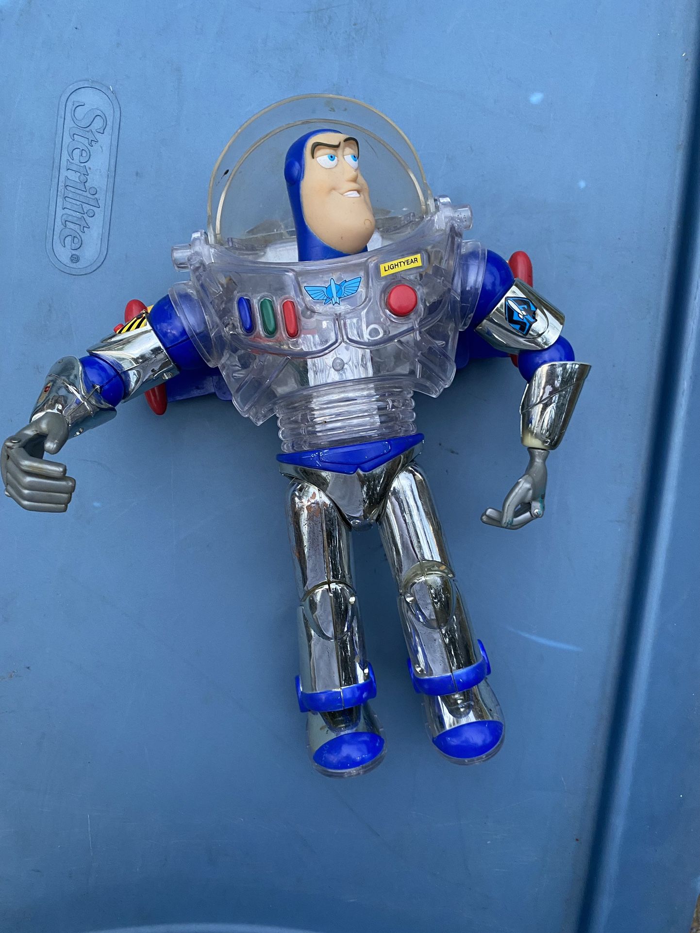 Buzz Lightyear in good condition. It stands about 12” tall. Will need batteries. Selling as is