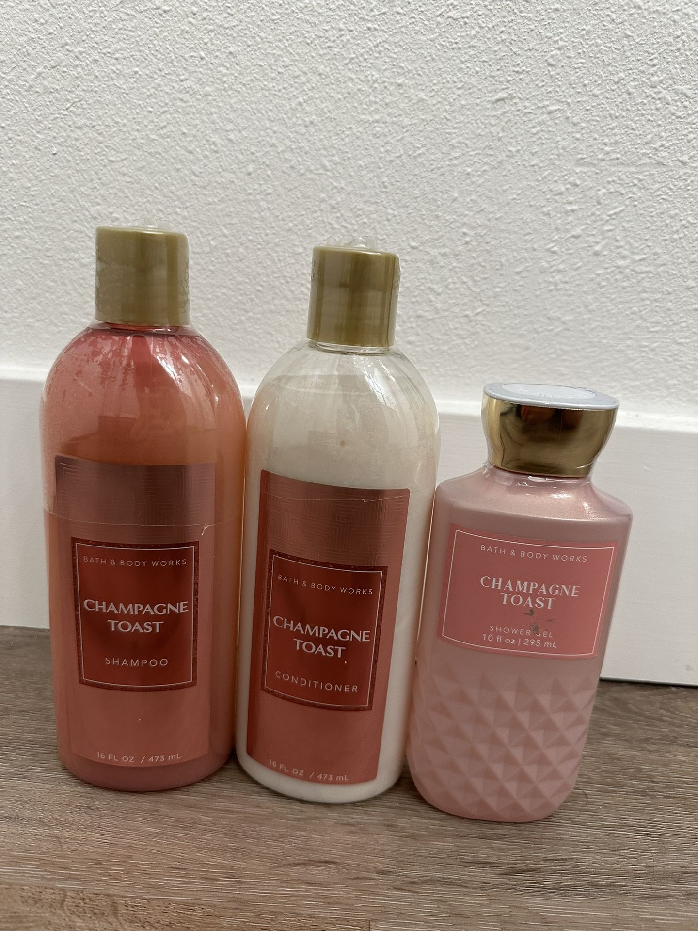Brand new never opened bath and body works shampoo, conditioner and body wash set in champagne toast.