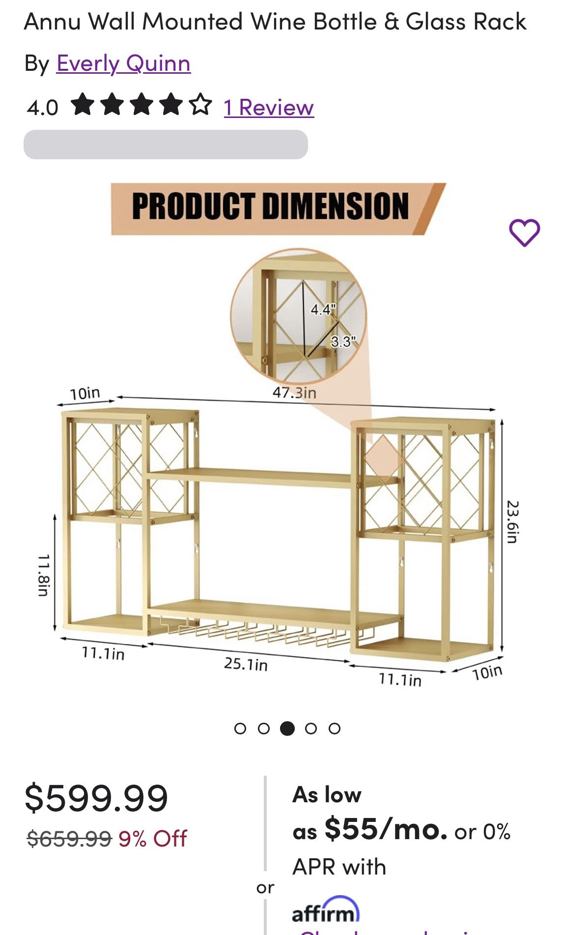Stunning wine bottle and glass rack. Purchased recently from Wayfair. Came very slightly dented on back top and had a tiny black dot on top back shelf. (Shown in pics). Does not affect the integrity of the piece. Link to Wayfair description with dimensions: https://offerup.com/redirect/?o=aHR0cHM6Ly93d3cud2F5ZmFpci5jb20va2l0Y2hlbi10YWJsZXRvcC9wZHAvZXZlcmx5LXF1aW5uLWFubnUtd2FsbC1tb3VudGVkLXdpbmUtYm90dGxlLWdsYXNzLXJhY2stdzExMDk3OTc4Ny5odG1s Currently listed on Wayfair at $599. Yours for $200!
