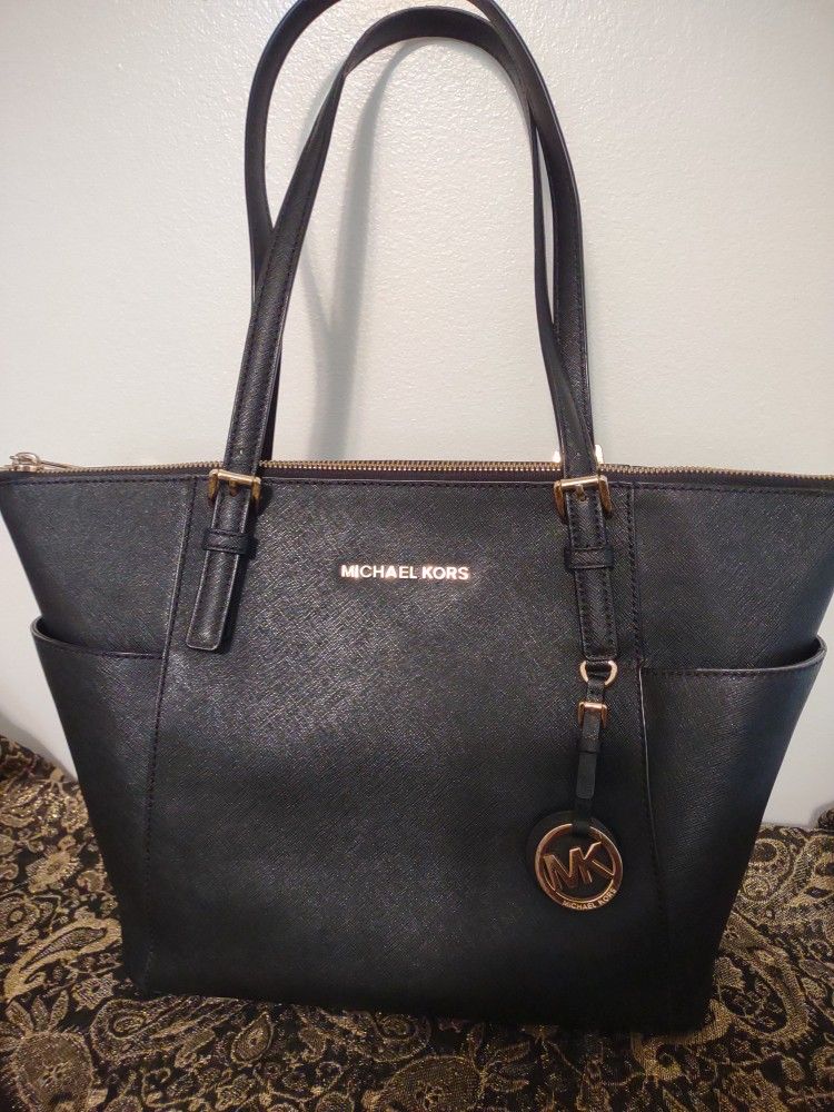 This is one of the best selling Michael Kors bags. Zippered closure. Exterior side pockets. Roomy interior with slip pockets. Bottom feet. Double adjustable straps. Some of the images are a bit blurry, but the bag is pristine.