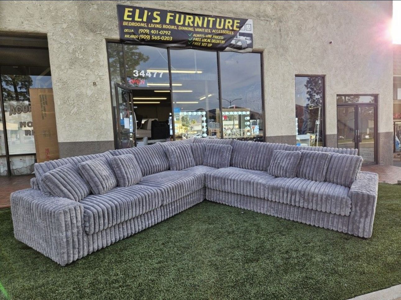 New sectional 3pcs corduroy fabric Light grey Pillows included $1699+tax Eli’s furniture Finance available Open 11am-7pm