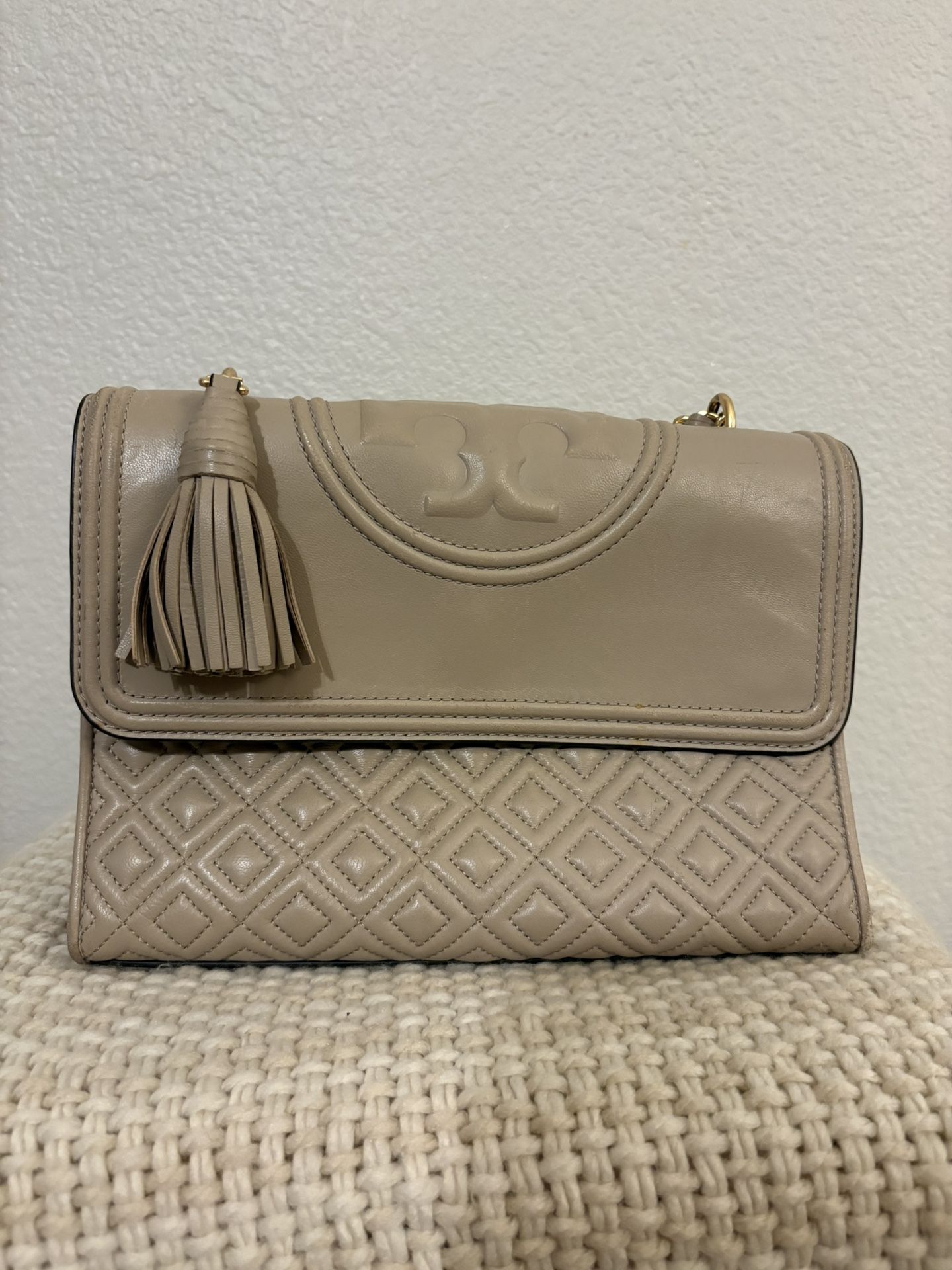 This elegant beige quilted handbag is perfect for any occasion. Its stylish design and neutral color make it a versatile addition to your wardrobe. Needs to be cleaned up but otherwise in good condition. Inside is clean.