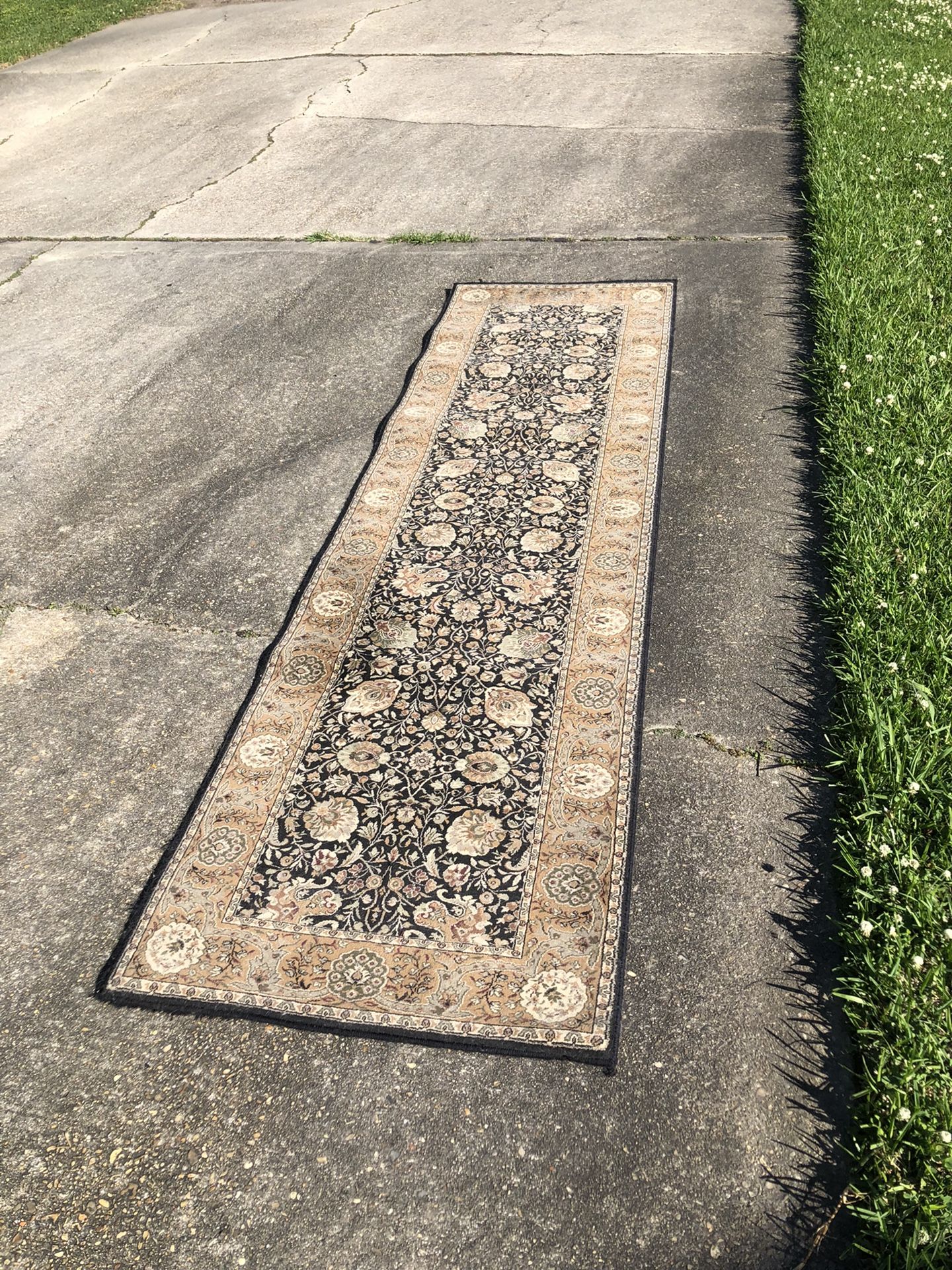 Primarily black with browns and neutral colors runner rug. Over all good condition, slight fraying in spots. Needs to be shampooed and vacuumed.