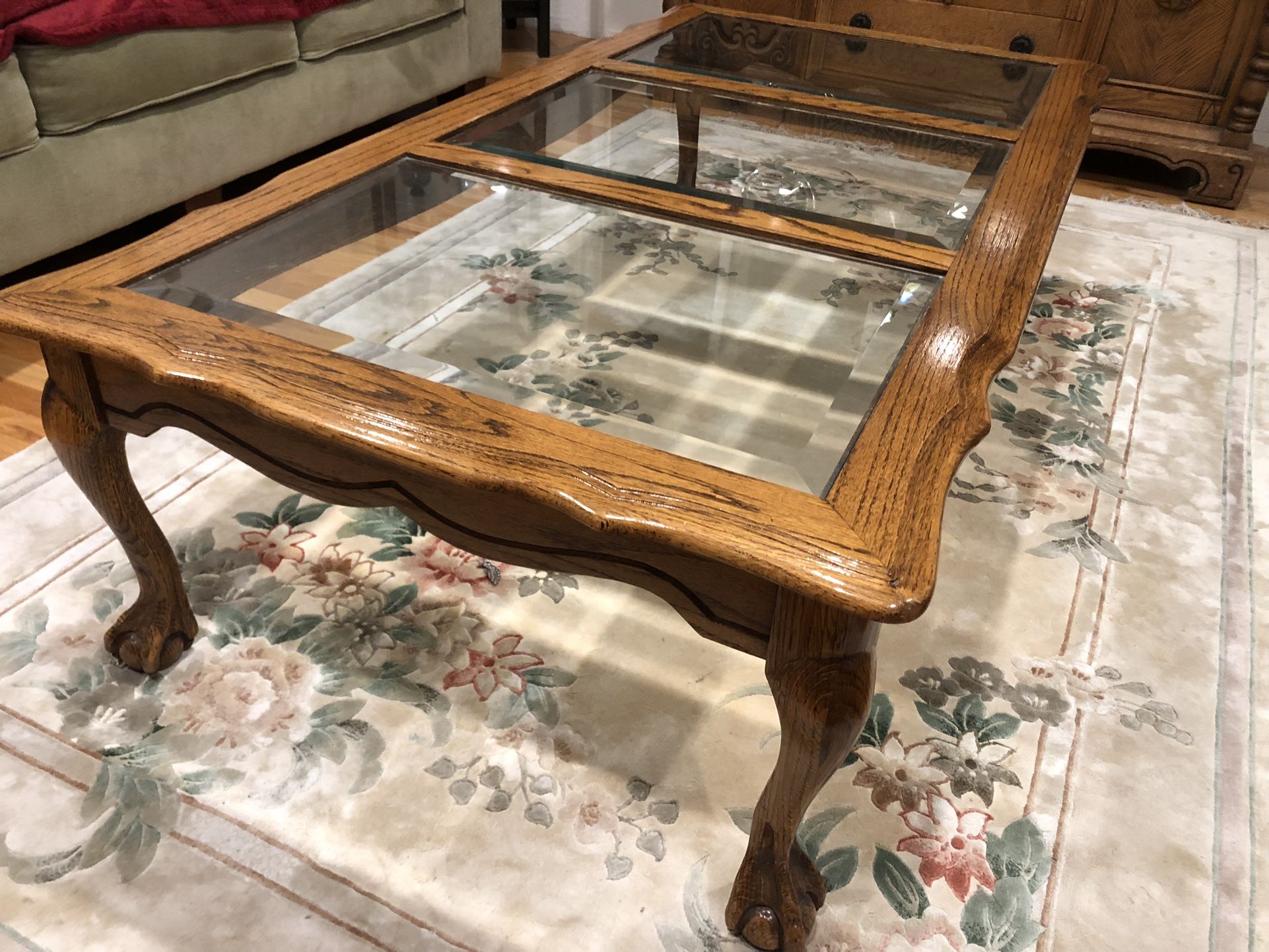 Solid oak with 3 beveled glass sections, curved legs, good condition