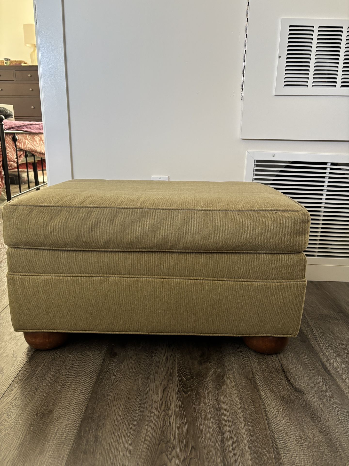 Beige ottoman Has some stains (see photos for reference). We had a slip cover on it. Dimensions: Length: 31” Width: 22” Height: 16 “ Pick up only.