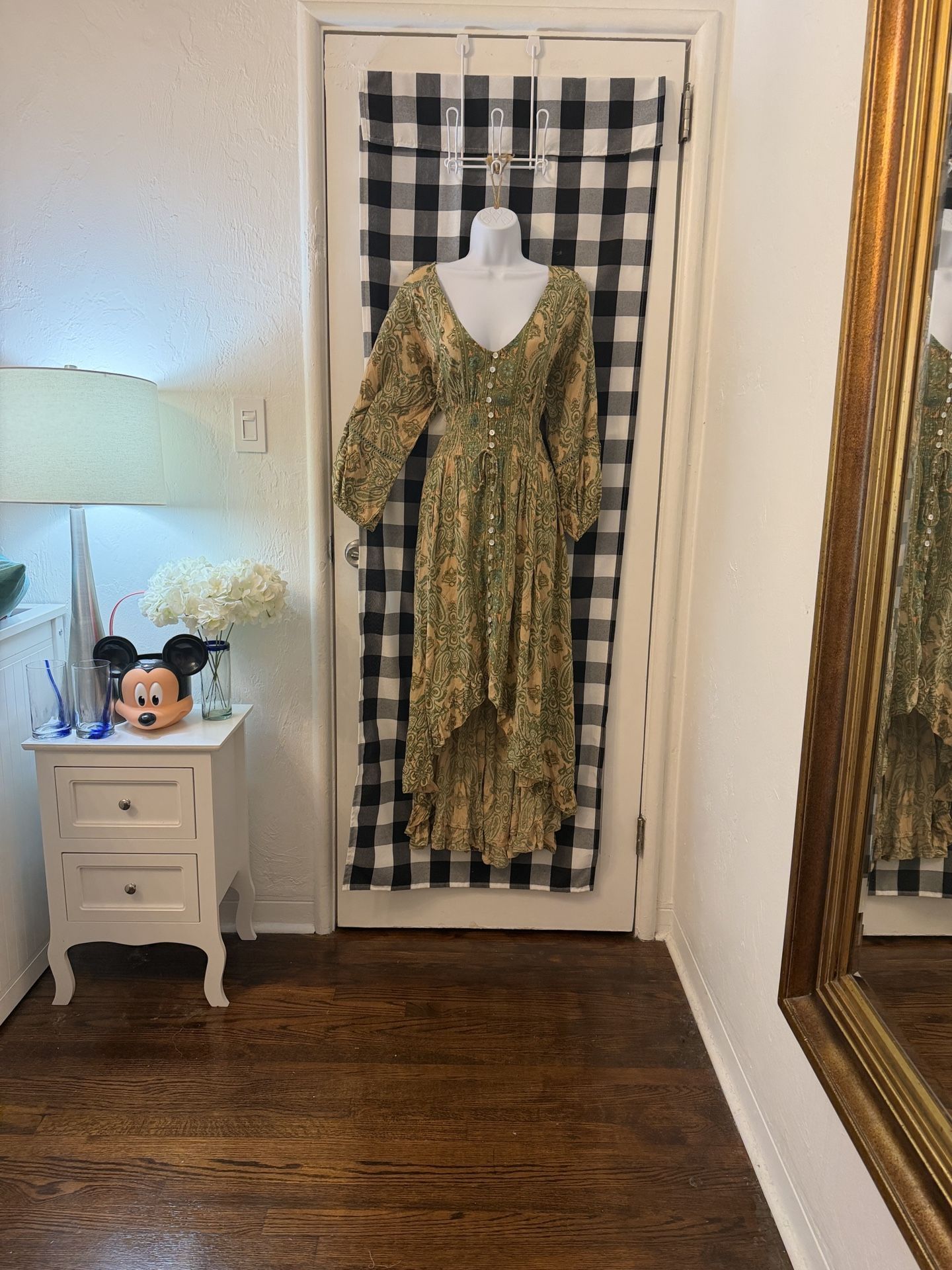 Elevate your wardrobe with this smocked waist button front beautiful silky bohemian flattering Hi-Lo Maxi dress. One Size really does fit most!! Relaxed Slimming, Sexy Silouette, with gold beading and sequins thru-out. Perfect for any occasion, it offers a blend of style and comfort.