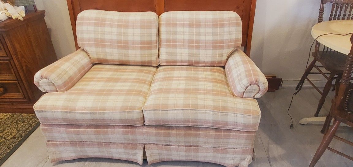 Cute Soft Plaid Pattern Loveseat Peach, Cream, and Light Green in Color 34" W x 31" D x 32" H $250 *In Great Shape