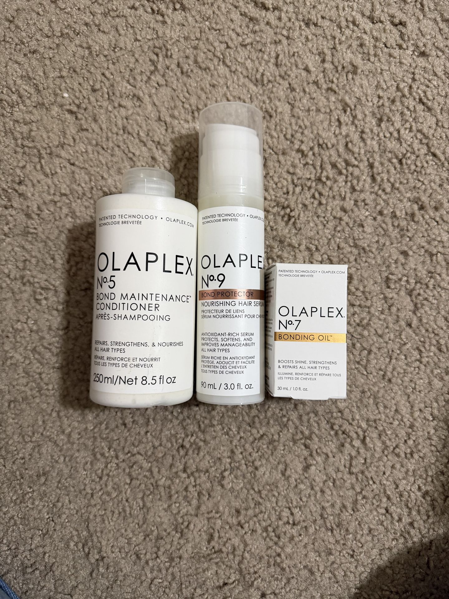 Selling an original OLAPLEX hair care set, designed to strengthen, protect, and nourish hair while adding shine and smoothness. Great for all hair types, especially damaged or chemically treated hair. Set includes: β’ π§΄ OLAPLEX No.5 Bond Maintenance Conditioner (250 ml / 8.5 fl oz) β Repairs, strengthens, and deeply nourishes hair. β’ π§΄ OLAPLEX No.9 Bond Protector Nourishing Hair Serum (90 ml / 3.0 fl oz) β Lightweight serum that protects against pollution and heat while improving manageability. β’ π§ OLAPLEX No.7 Bonding Oil (30 ml / 1.0 fl oz) β Adds shine, smoothness, and heat protection.