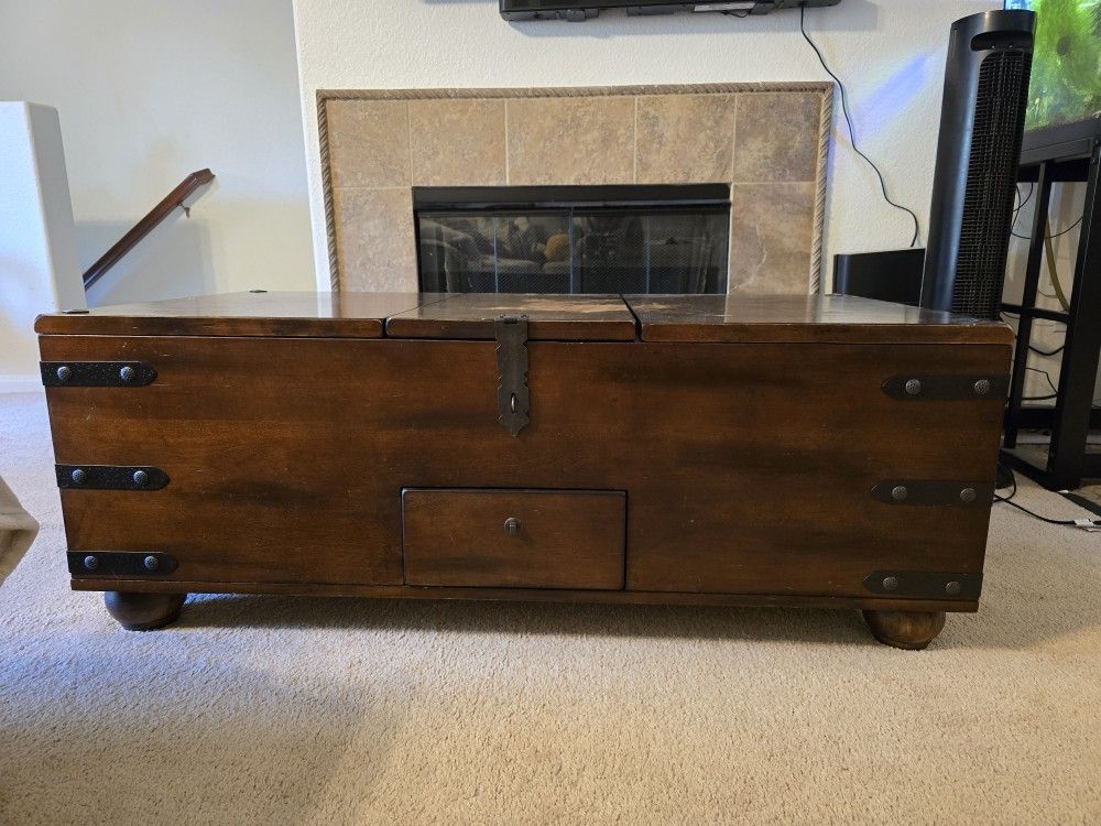 Bring quality and charm to your home with this matching solid wood coffee table and side table set. Both pieces are sturdy, heavy, and built to last. They’re in great condition, with the coffee table featuring a surface stain that adds character. The coffee table offers plenty of space for books, décor, and entertaining, while the side table provides two compartments for convenient storage. Dimensions: Coffee Table: 48” L x 24” W x 18” H - $100 obo