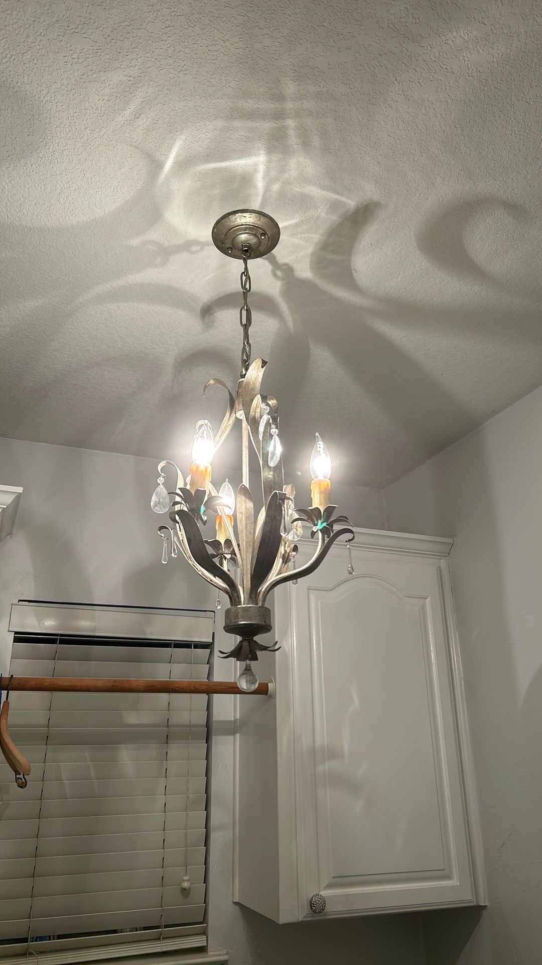 32 inches from ceiling to the bottom of the chandelier… 12 inches wide