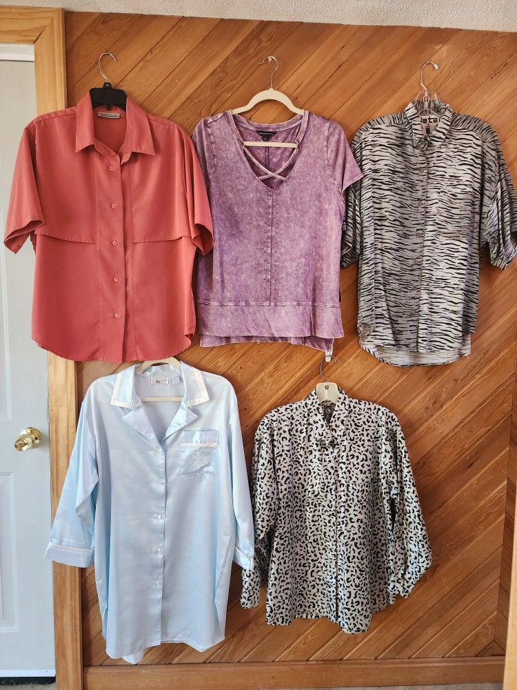 $10 EACH! WOMENS BLOUSES/TOPS: 1) NEW W/ TAGS, ROCK & REPUBLIC, ROSE, SIZE M SHIRT ~ 2) ZEBRA, SHORT SLEEVE, BLOUSE, FITS M TO L ~ 3) NEW, LEOPARD, LONG SLEEVE, FITS M TO L ~ (SALMON & BLUE BLOUSES ARE SOLD) ~ EXCELLENT CONDITION ~ PICK UP IN LYNNFIELD