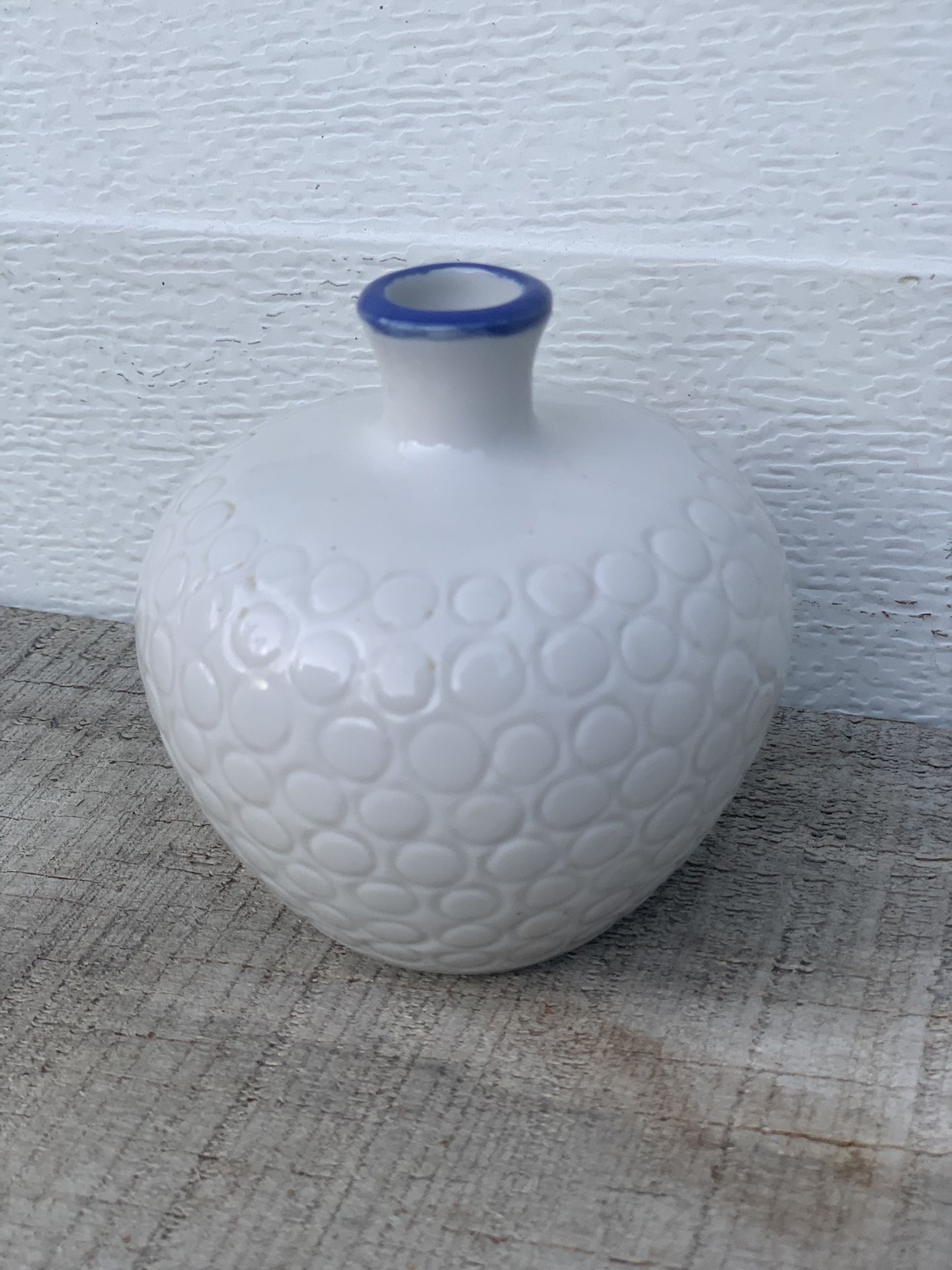 Vintage Mini white ceramic vase with a raised dimple texture and hand painted a blue rim 3x3”. Made in china.