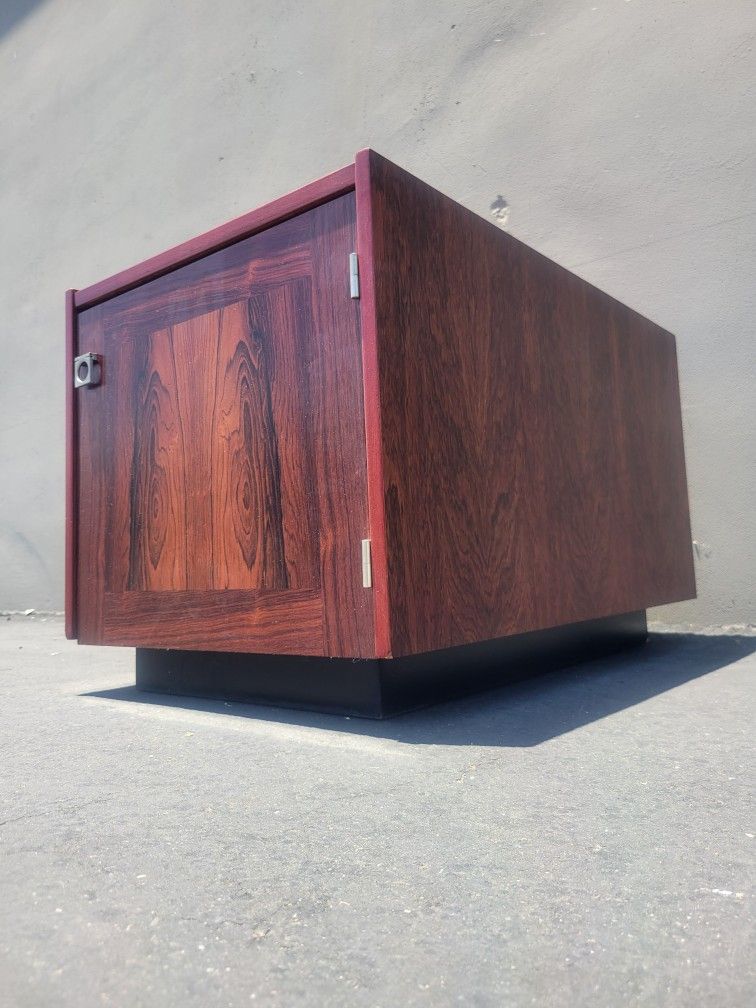 Hi! Here's a stricking rosewood side end table for Borholm Mobelfabrik. Floating cabinet with double sided storage and metal pull. Solid sturdy piece with minimal signs of wear to age. This piece is vintage and ready for your space! Send me a message if interested thanks! W20×D31.5×H19