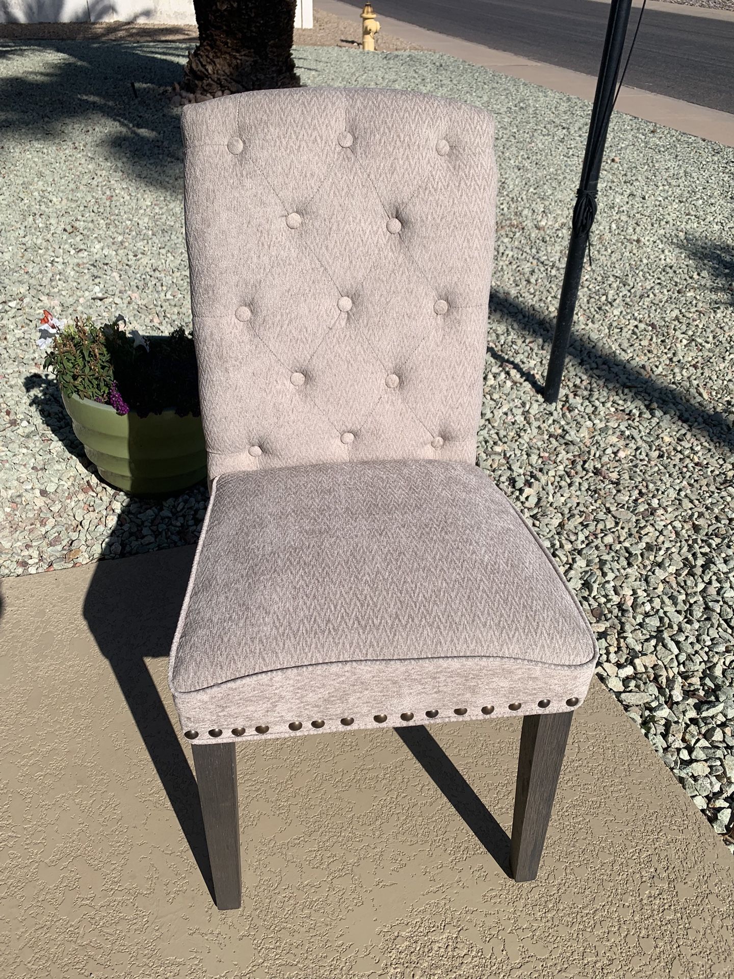 Chenille dining chair. Chair color champagne. Seat offers nailhead accent, diamond design on seat back and wooden legs. Can also be used for an office chair or accent chair. Dimensions: 38” Chair height 18.5” width 20” Seat to floor 16” Seat depth