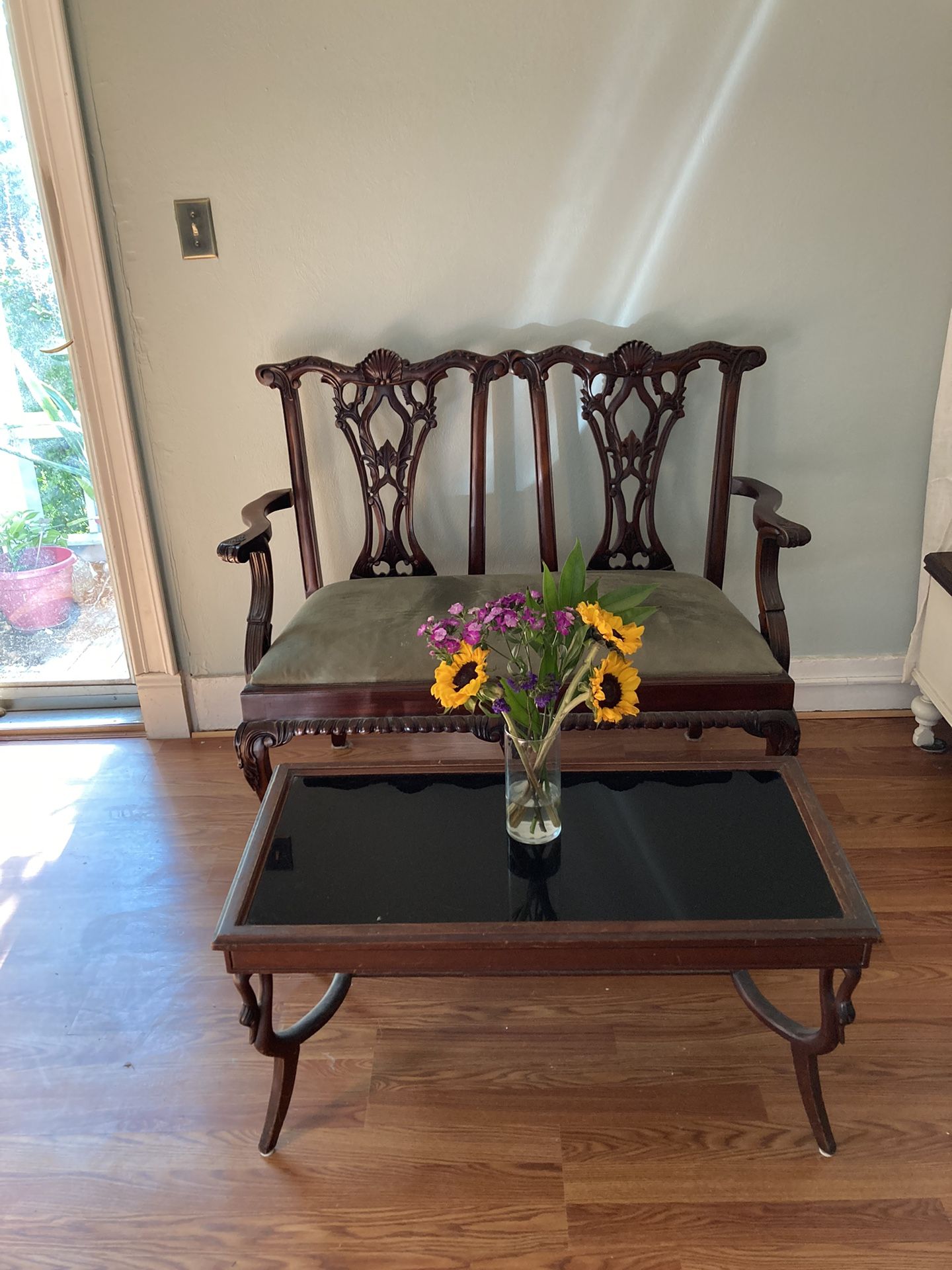 Small coffee table with swan carved legs and black glass top. Can be painted, finished or used as is 36” wide,17” high, 18.5” deep. Settee in picture is also for sale.