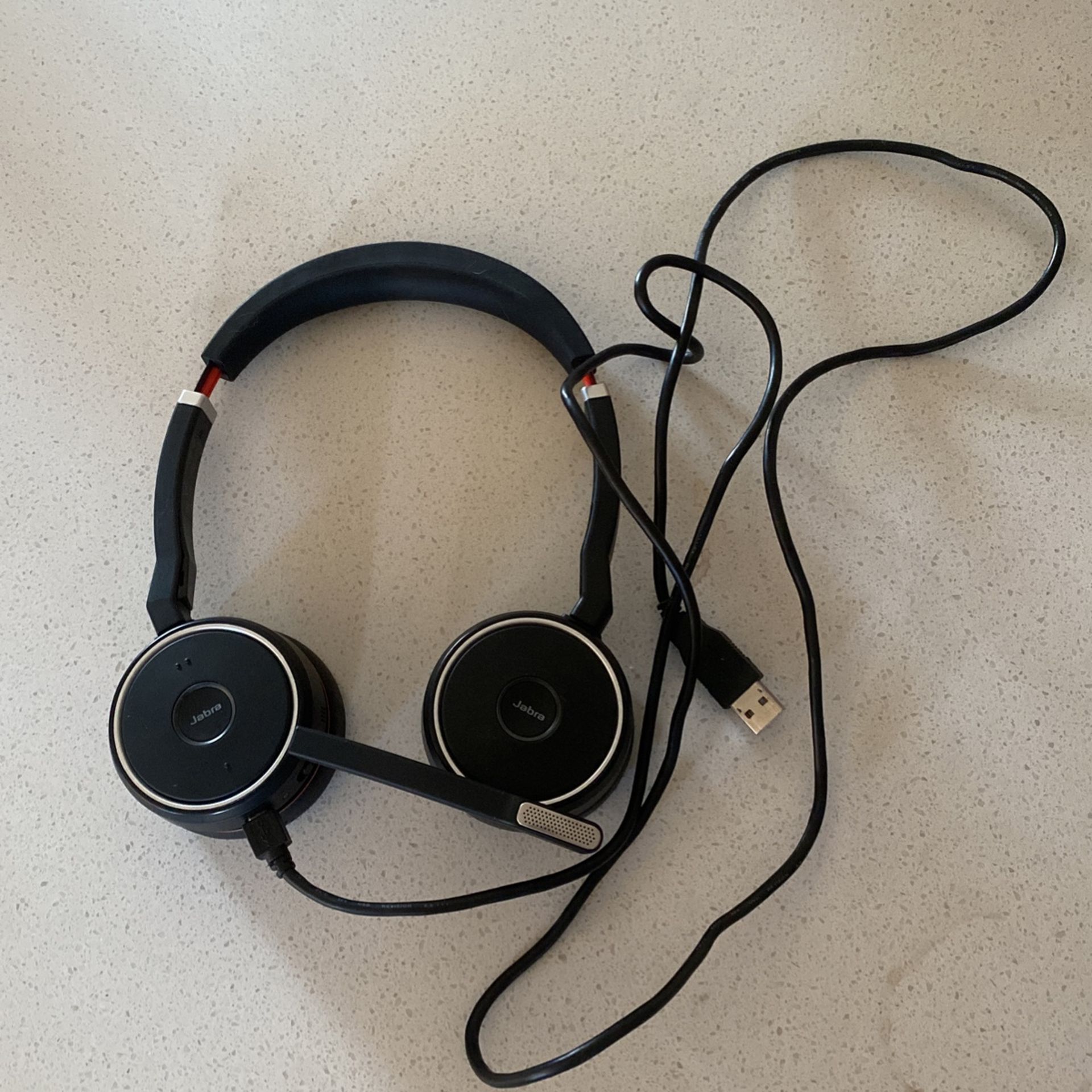 Jabra Evolve 75 headset - noise cancelling abilities, all day battery life, usb cable for connecting to laptop or port to charge, bluetooth connectivity to phone or laptop.