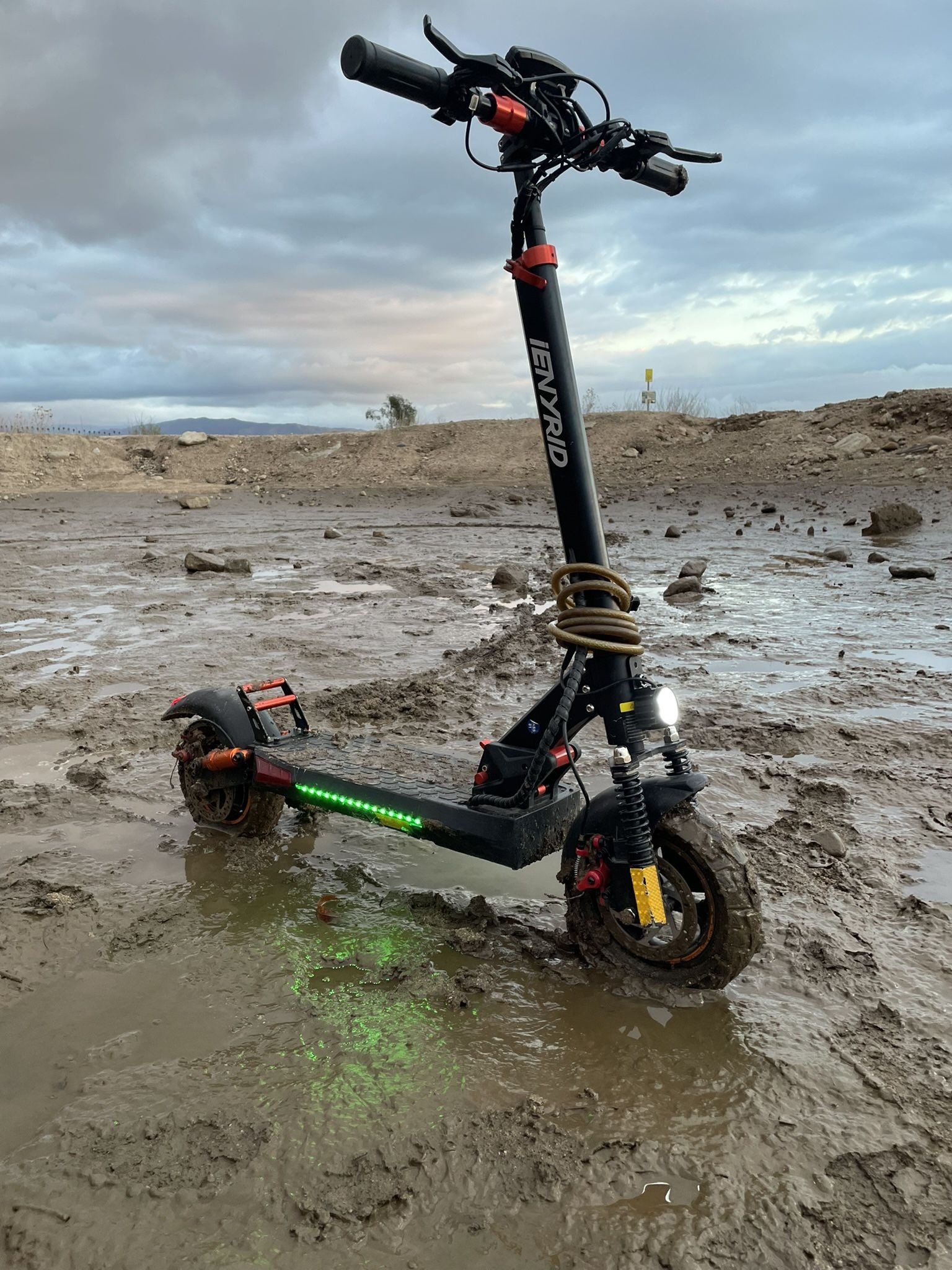 Iyenrid E-scooter 28mph 15amp 750w comes with charger and spare break rotor, break pads, and inner tube The e-scooter has 500miles on it and has no damage besides some scratches on the bottem and a broken rear fender and the front break lever is bent but it still works fine willing to go lower too it has rgb underglow and a front headlight with turn singles and a horn brand new on Amazon this scooter is 600$