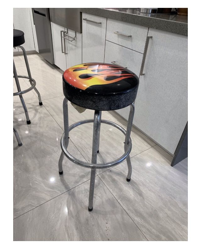 Chrome stool chair One Black with flames Height 31” Width 13” One plain with no flames