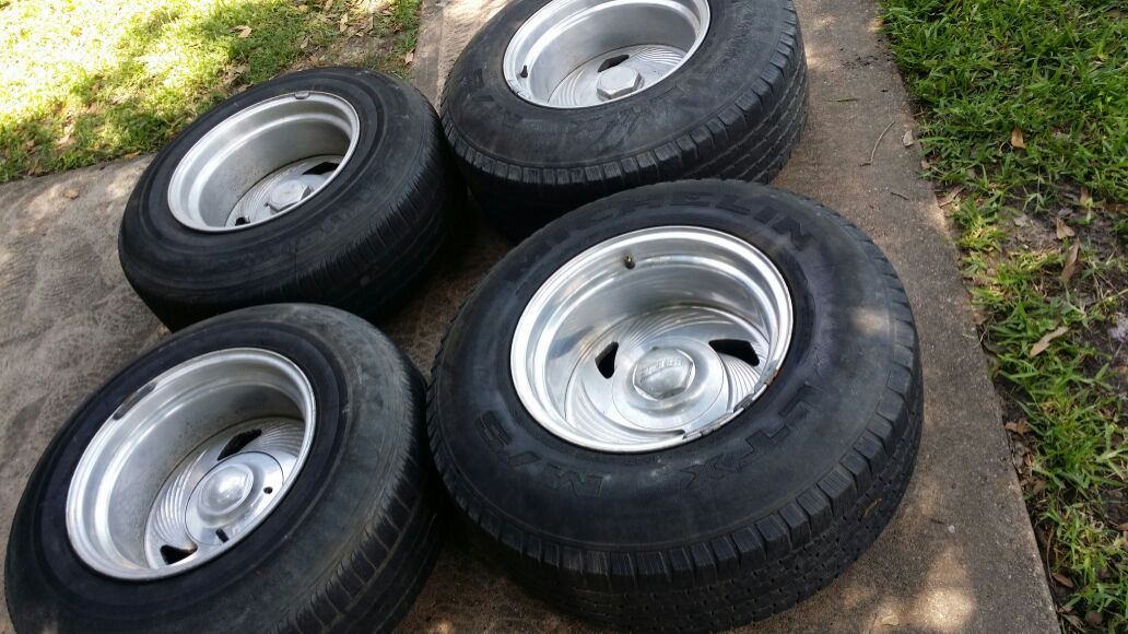 15x10 but could be by 12 have to measure them they really wide Eagle alloys universal for chevy and ford 5 lug big bolt pattern asking 200$ located in alvin texas will tradr for double din and 100$ or just cash tires are good for a while but mail selling rims Aluminum style call or txt me If you are interested ask for number