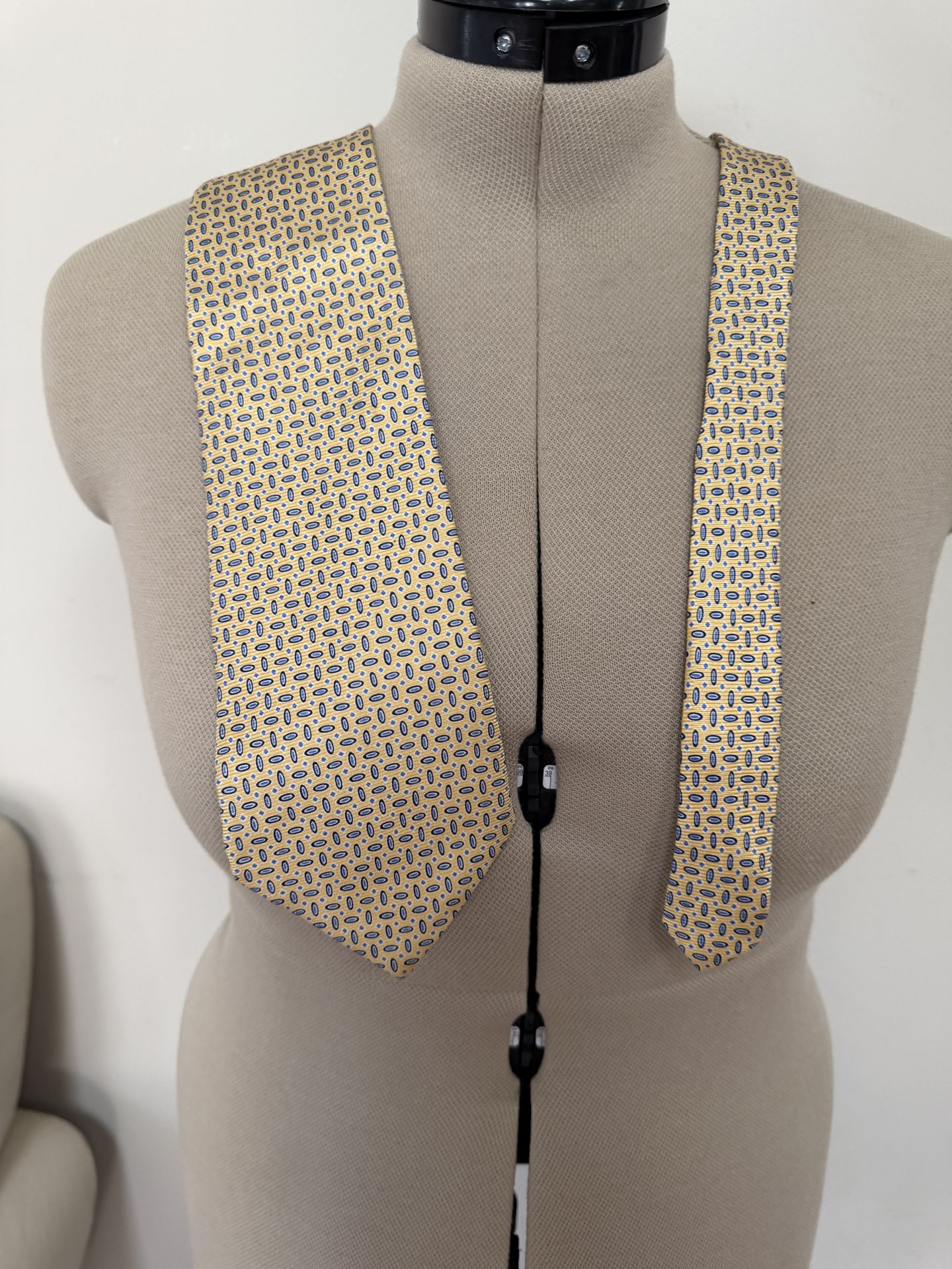 yellow silk necktie from Lauren Ralph Lauren featuring a blue and white geometric pattern.