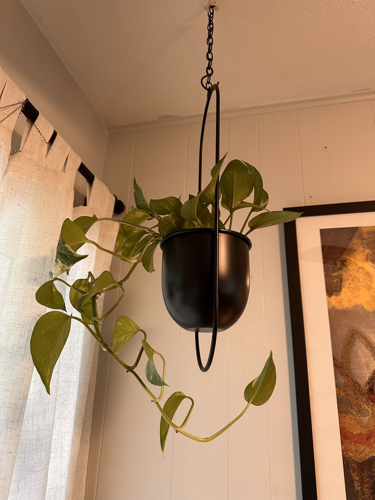 Live Plant in Black Metal Hanging Planter. Part of an international moving sale. Please explore our other items for deals on bundles!