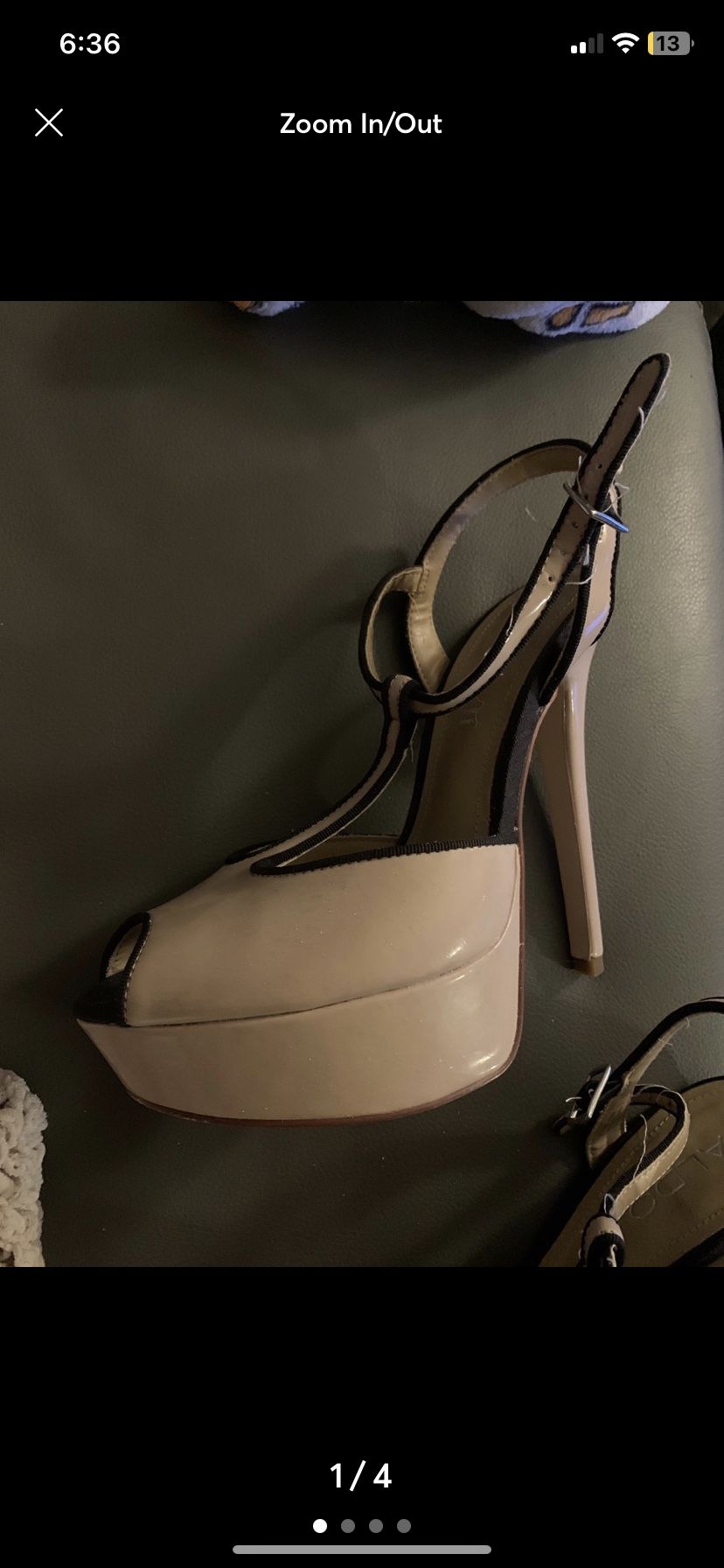 Gently used, nude colored faux leather material. Some scuffing in soles, wearing on ankle strap
