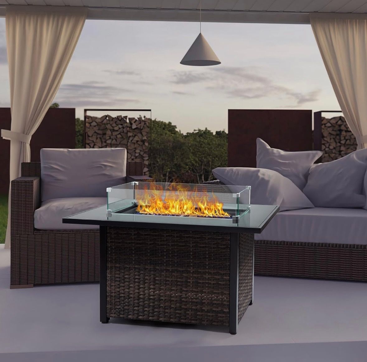 Brand new still inside the box 50,000 BTU Outdoor Propane Gas Fire Table - 44-Inch Square Fire Pit with Lid, Glass Wind Guard & Weather-Resistant Wicker Base for Patio, Backyard, Garden Heating Material PE Rattan+Iron,Rattan+Glass Product Dimensions 27"D x 44"W x 25"H Shape rectangular 50,000 BTU Commercial-Grade Heating Instantly warm 15ft radius (8-10 people) with dancing flames & dual-layer glass wind guard. Adjustable flame height (20k-50k BTU) adapts to breezy evenings or intimate dinners. 3x faster heating than standard patio heaters. Smart Dual-Function Design Day Mode: 44" tempered glass tabletop (holds 50lbs) for drinks/BBQ tools Night Mode: Mesmerizing centerpiece with flickering ember bed Bonus: Removable waterproof lid protects from rain/leaves 5-Minute Hassle-Free Setup ✓ Push-button ignition (No matches!) ✓ Hidden 20lb propane tank compartment ✓ Quick-connect Color Black brown